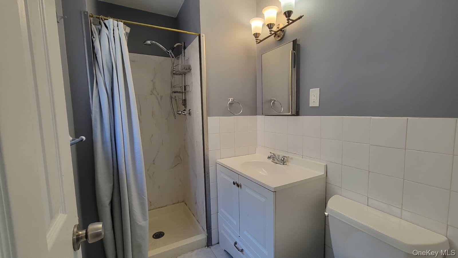 - Full bathroom featuring vanity, a stall shower, and tile walls