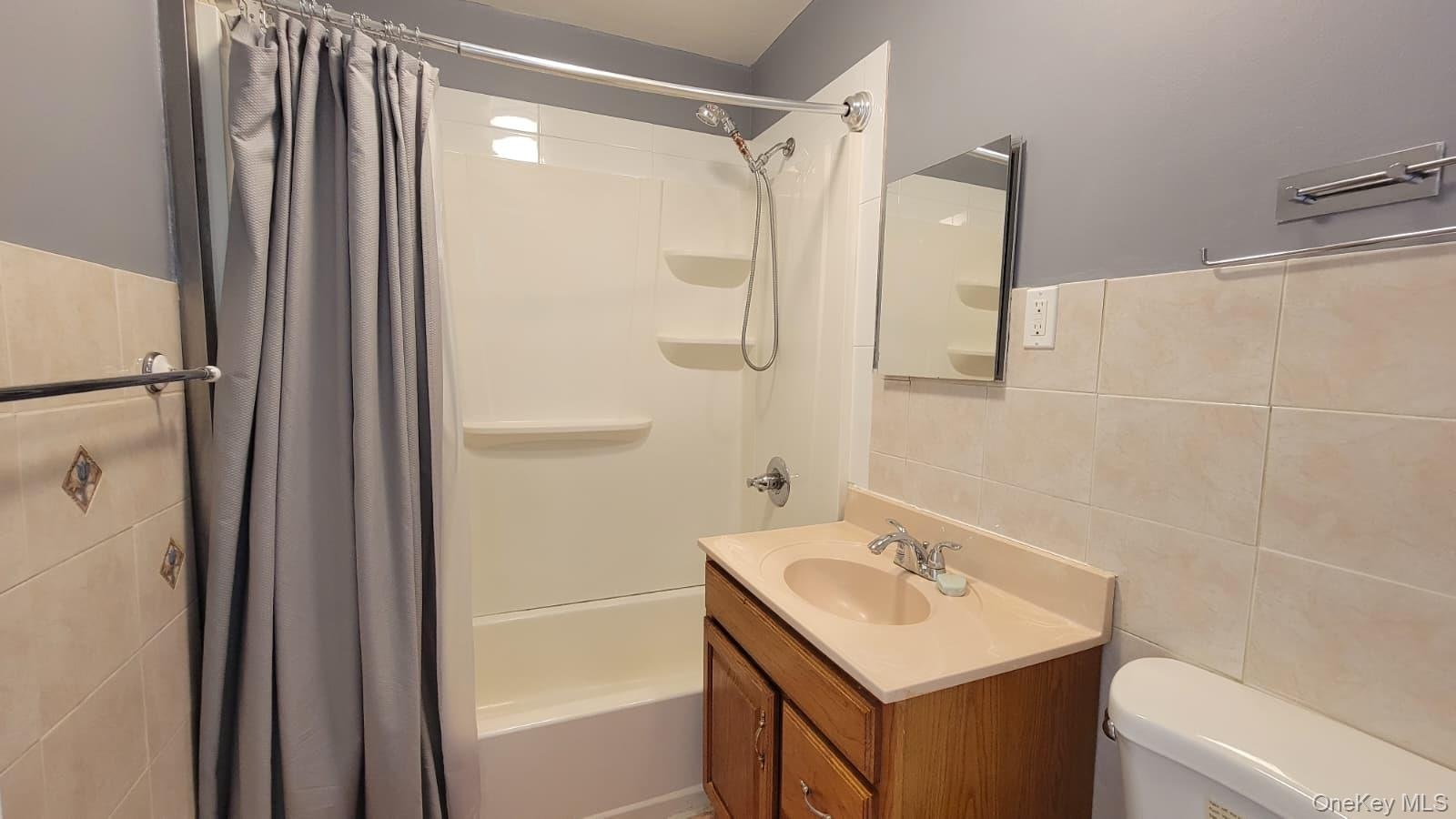 - Bathroom featuring tile walls, shower / bath combo with shower curtain, and vanity