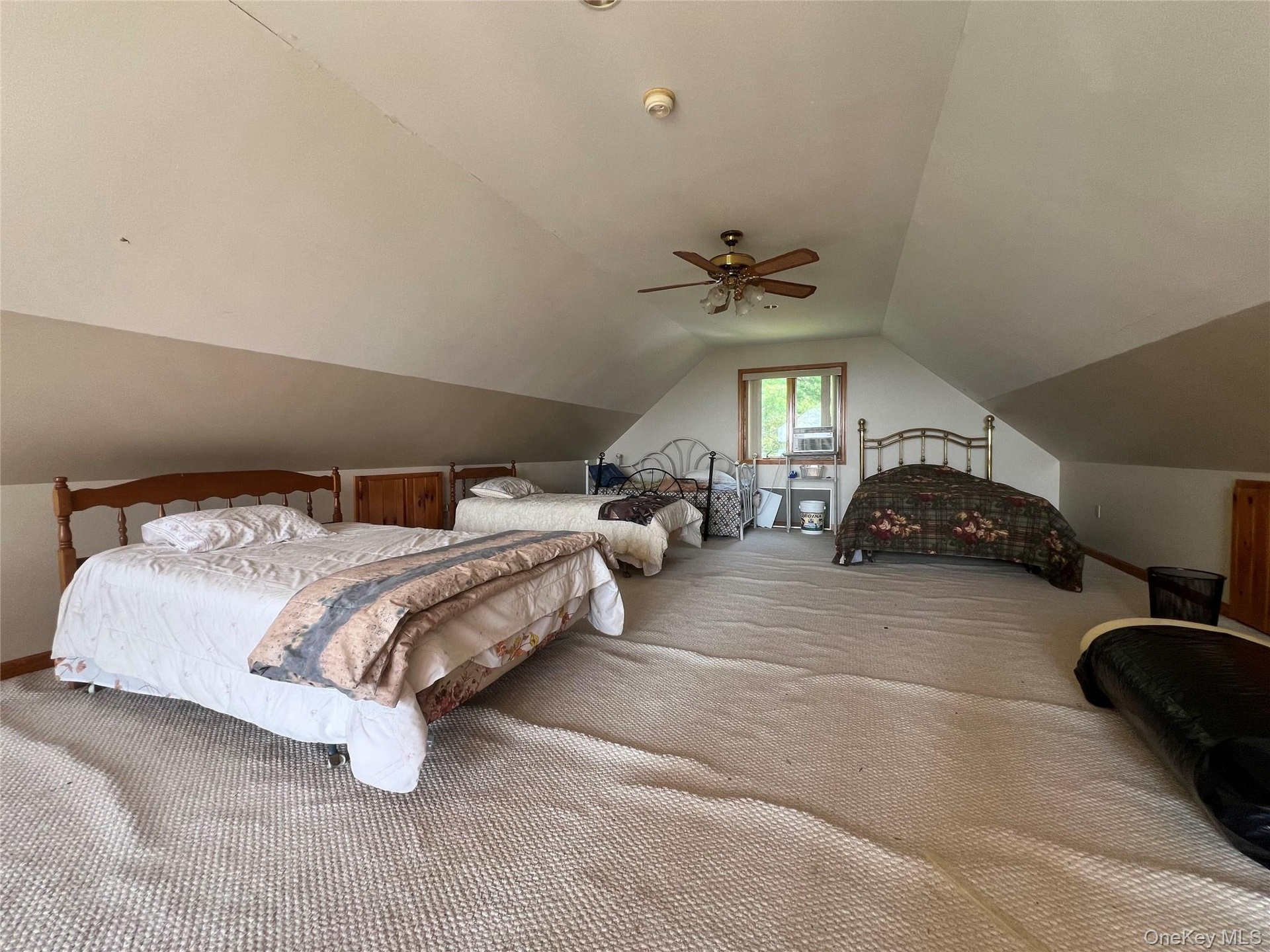 - Carpeted bedroom with vaulted ceiling and ceiling fan