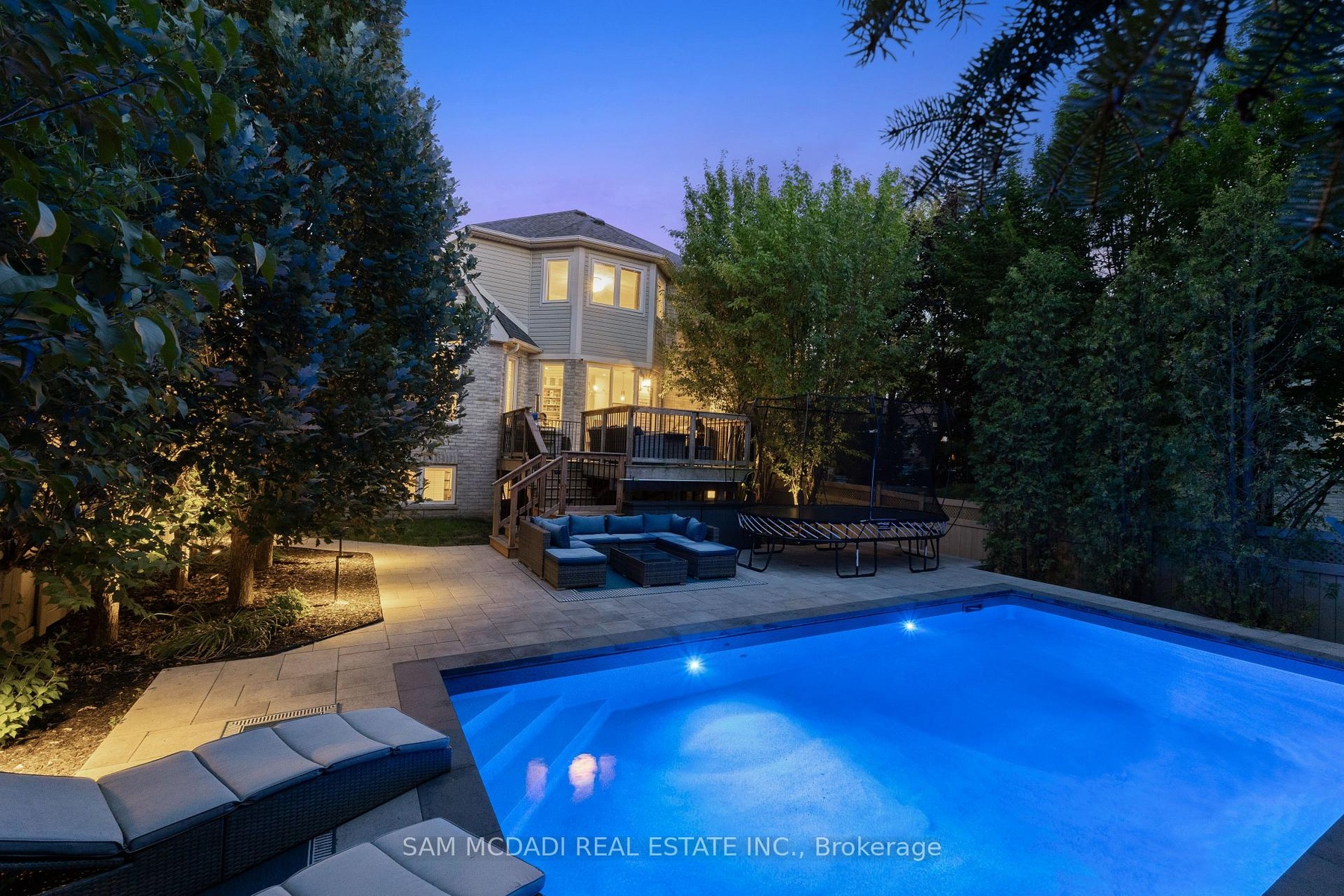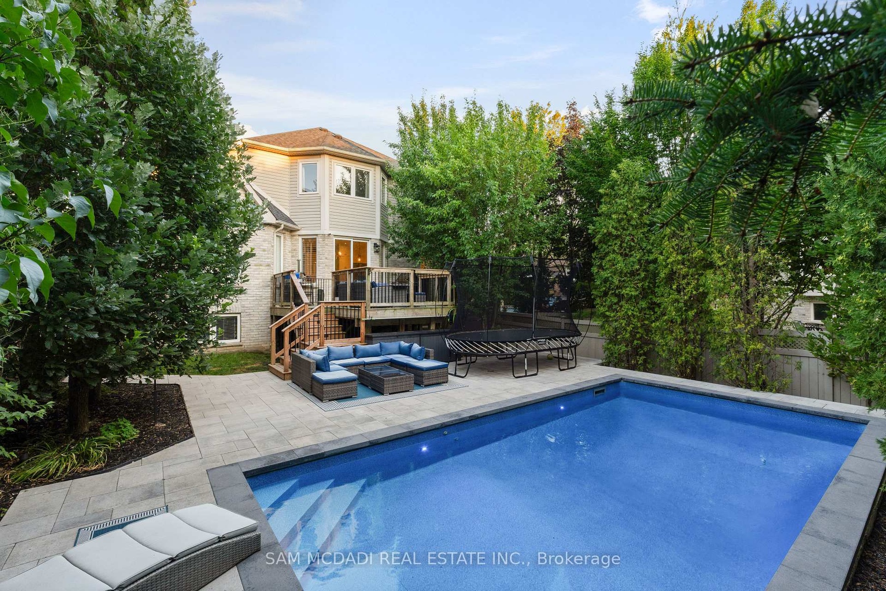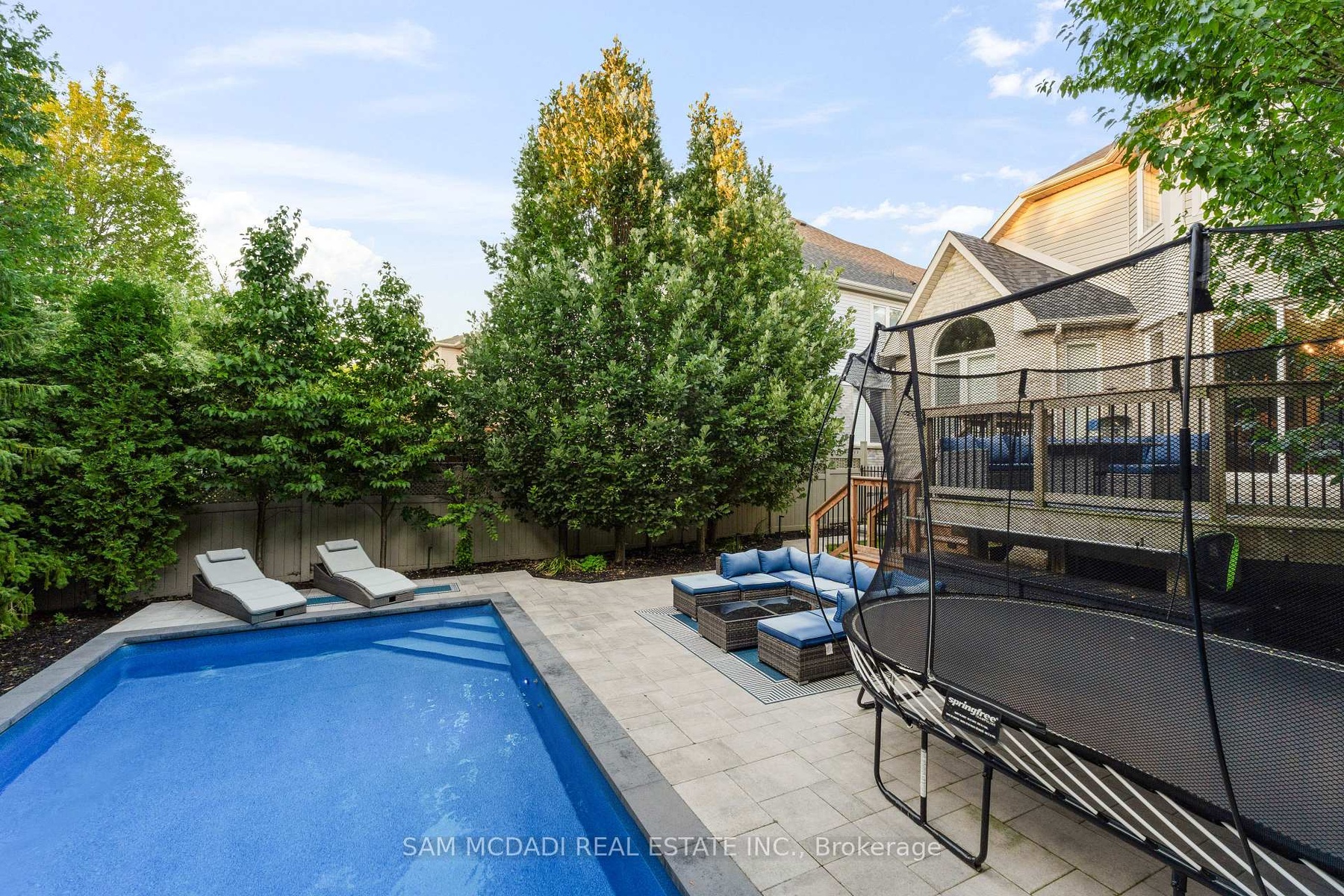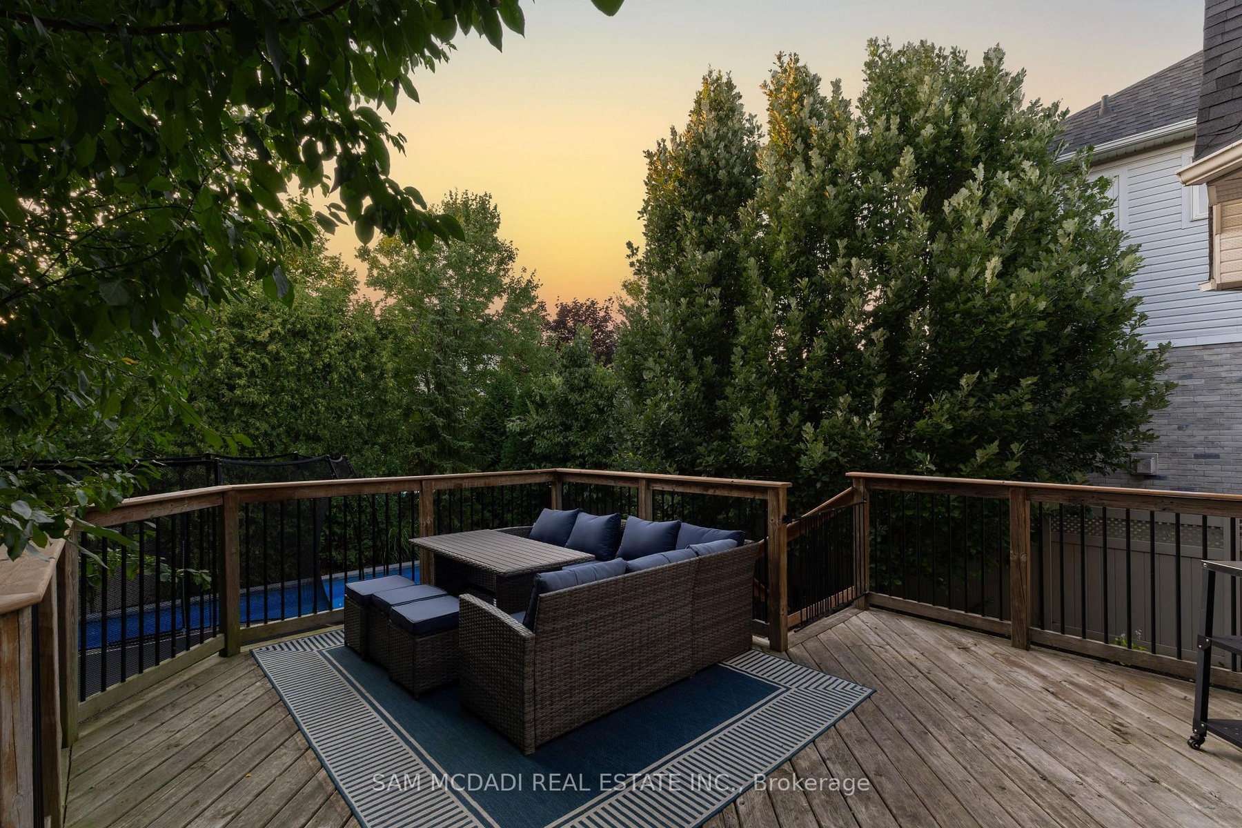 DescriptionNestled on a quiet crescent in Burlington's established Millcroft community, this beautifully updated 4+1 bedroom, 4-bathroom home offers over 3,800 sq ft of stylish, functional living space tailored for modern family life and effortless entertaining. From the moment you enter, thoughtful upgrades shine, LED pot lights, oversized windows, and walnut-engineered hardwood floors set a warm, sophisticated tone. The standout family room impresses with its vaulted ceiling, gas fireplace, and arched windows that flood the space with natural light. The open-concept kitchen and breakfast area walk out to the backyard deck, seamlessly blending indoor comfort with outdoor living. Designed with both beauty and performance in mind, the kitchen features Cambria quartz countertops, a $14,000+ Miele induction range, KitchenAid appliances, and a built-in microwave neatly integrated into the island. Upstairs, the serene primary suite invites relaxation with a spa-like ensuite featuring a freestanding slipper tub, frameless glass shower, dual vanities, and a heated towel rack. Three additional bedrooms and a full bathroom complete the upper level with ample space and comfort. The finished basement extends the home's versatility with a bright recreation room, fifth bedroom with walk-in closet, full bathroom, and generous storage. Step outside to your own private backyard resort. Redesigned in 2023, the outdoor space boasts a custom $160K upgraded inground pool, multi-level lounging areas, and a low-maintenance vinyl fencing for full privacy. Landscape lighting (2024) adds a touch of evening ambiance, while Wi-Fi-enabled irrigation and pool controls put smart convenience at your fingertips. Superb location just minutes to top-rated schools, Millcroft Golf Club, parks, shopping, dining, with easy access to Highways 407 & QEW and transit via Appleby GO Station.Amenities- Auto Garage Door Remote