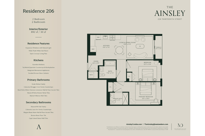 Introducing Residence 206 at The Ainsley, a spacious and sophisticated 2-bedroom, 2-bathroom home that combines modern luxury with outdoor living. Spanning 892 square feet, this residence features a generous layout and private outdoor space, making it perfect for both entertaining and everyday living.