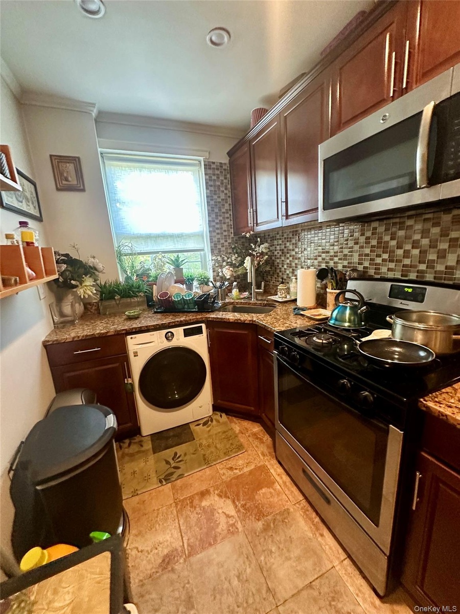 - Kitchen featuring stainless steel appliances, decorative backsplash, crown molding, washer / dryer, and dark stone countertops