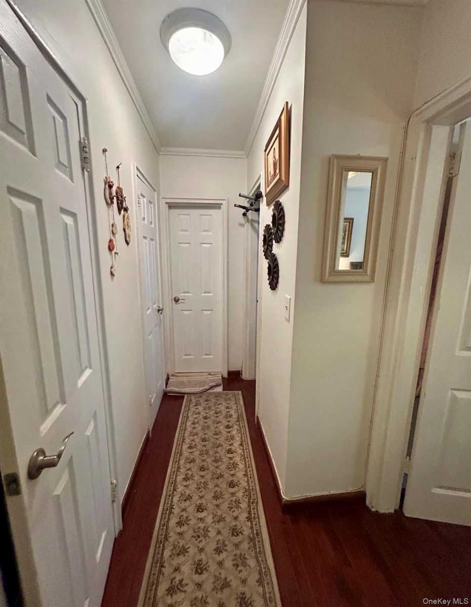 - Hallway with dark wood finished floors the back door leads to the bathroom, the left side doors are two deep closets