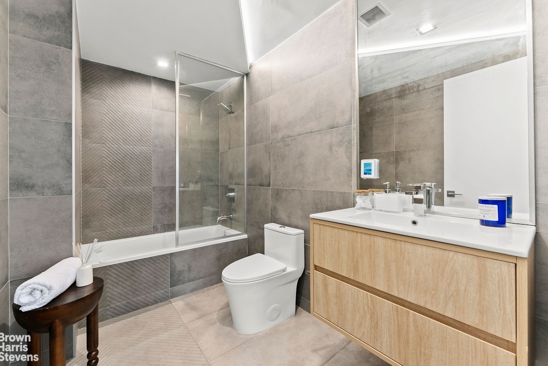 A chic wood-and-steel staircase leads to two light-filled bedrooms, each with south-facing windows. The primary suite includes a walk-in closet, private balcony, and a spa-like en-suite bath with heated floors, a deep soaking tub, sleek glass shower doors, and a floating vanity. The second bedroom has its own closet and is across the hall from a second full bath with equally high-end finishes.