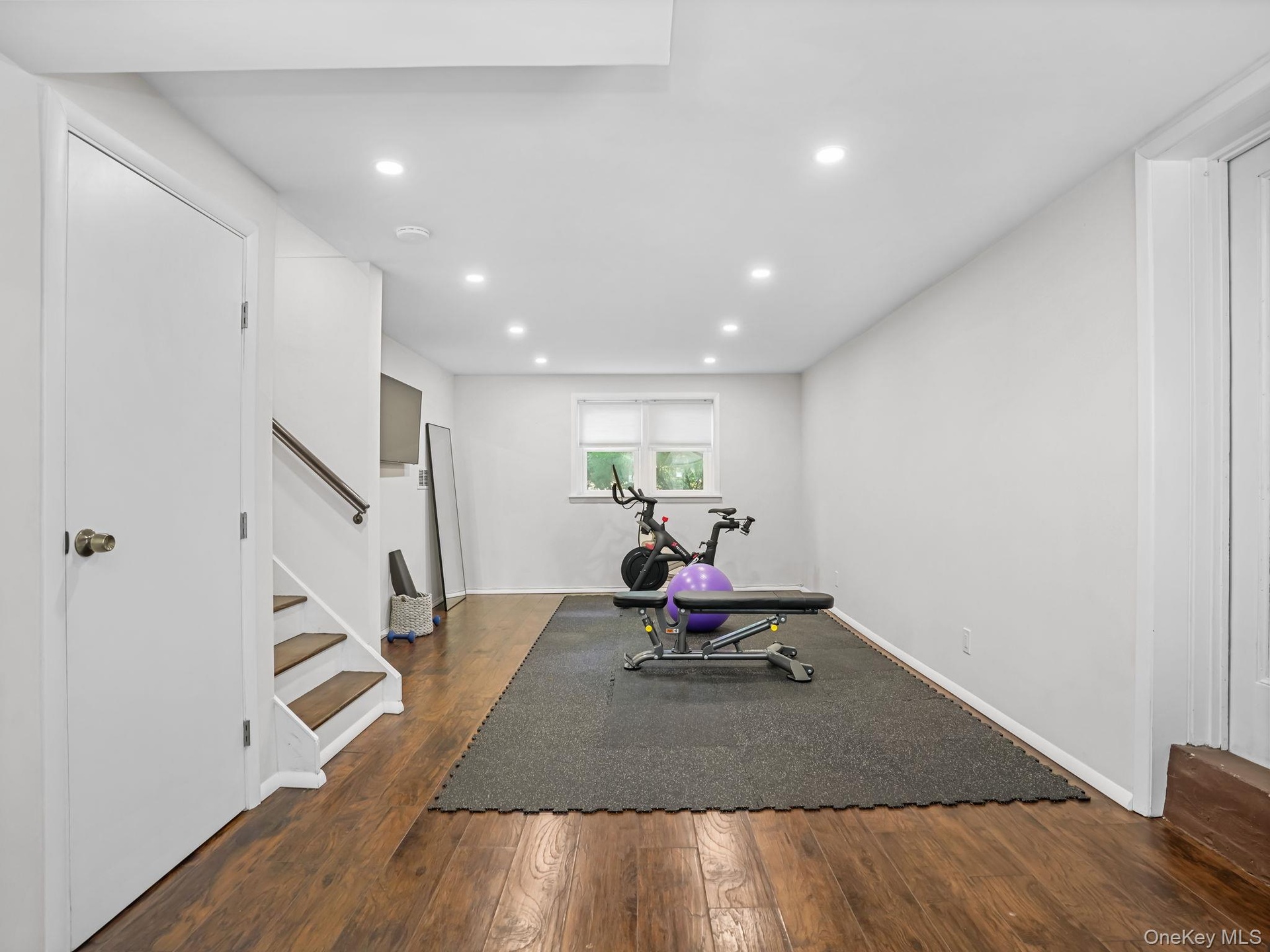 - Exercise area featuring recessed lighting and dark wood-type flooring