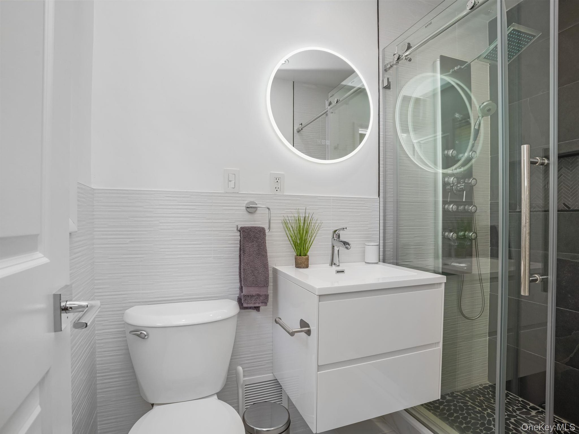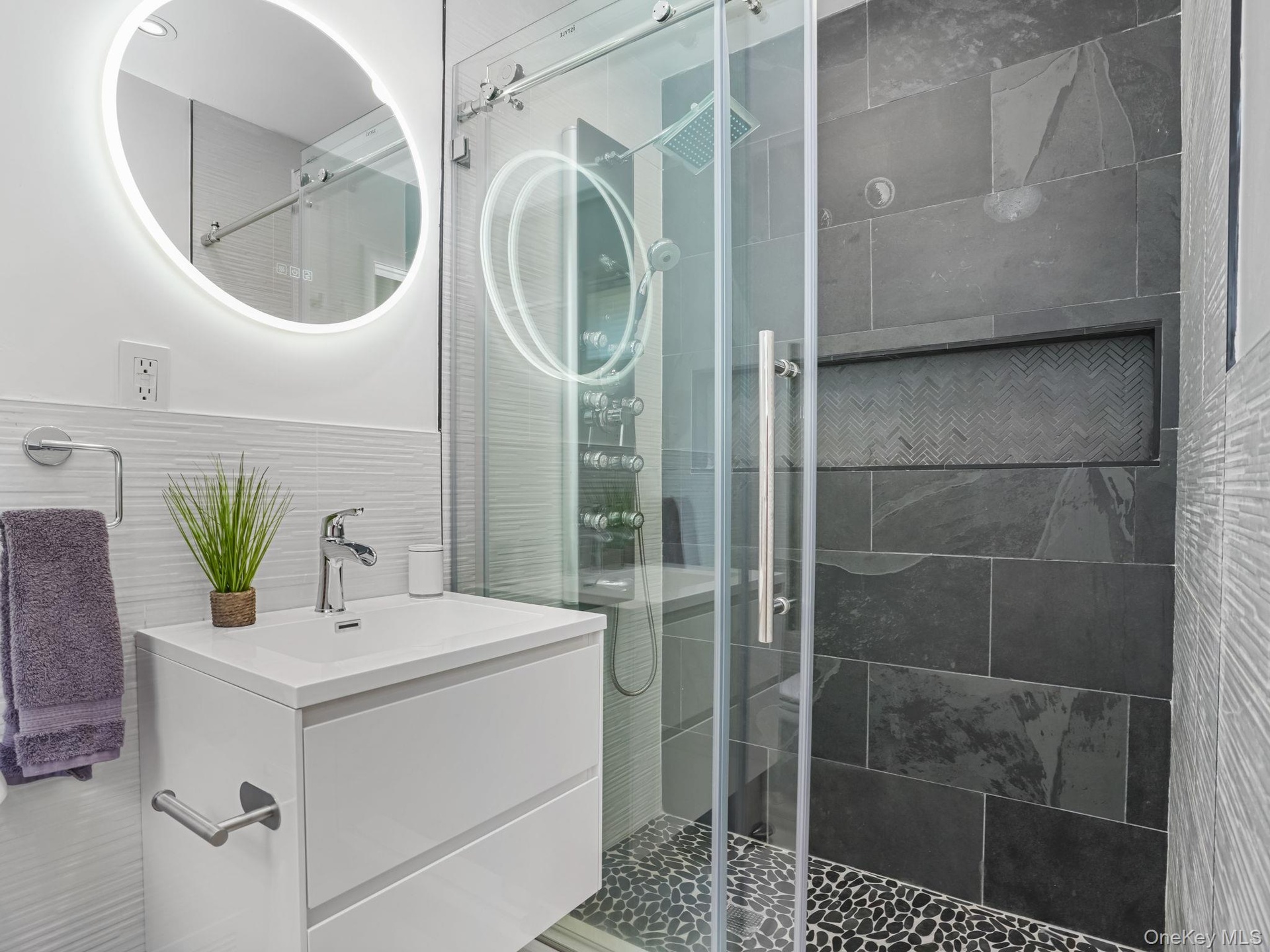 Pretty in Pinebrook Estates! Luxuriously updated throughout--this multilevel beauty will not disappoint! Pass through the decorative stone entranceway and charming Wendover blue front door, and you'll be captivated by the open layout and thoughtful details that make this home truly special. The beautiful hardwood floors are illuminated with natural sunlight pouring in from every window. Bright white shaker cabinets, dolomite marble and ceramic designer backsplashes and 2" Pentelikon white marble counters adorn the elegant chef's kitchen. All stainless steel, professional-grade Viking, Wolf and Sub-Zero/Asko appliances including an Avallon dual-zone wine cooler, two sinks and an open dining area are sure to satisfy. A grand, 8-foot blue accent island with seating completes the experience and perfectly transitions the space into the living room where you will enjoy relaxing by the 60" custom-built electric fireplace and large bay windows. Only a few steps away is a modern full bathroom complete with a 60" double vanity, enormous LED mirror and shower/tub with glass enclosure. Three, sun-filled bedrooms share the second level of the home. The primary bedroom features a spa shower system, basalt stone tilework w/niche, a sleek sliding glass shower door and floating vanity with LED mirror. Ascend up a few more steps to the third level where you will find a spacious bedroom with two walk-in closets and adjacent 362 sq ft partially finished attic--perfect for storage or future expansion. The lower level of the home serves as a flexible space that works great for use as a family room, workout space or office as there is a bathroom conveniently attached. Walk a few more steps down to the clean and sizable basement where you will find laundry and an abundance of storage space (an additional 726 sq ft--not counted in the overall square footage). New central air-conditioning condenser and mini-split system. Fully fenced backyard with a generous patio seating area for peaceful outdoor enjoyment. Professionally designed landscaping and lighting throughout the property. Two car driveway with attached garage. Located just minutes from many restaurants and shops, golf courses, trails, houses of worship and schools. Short 30-minute commute to NYC and close to all major highways.