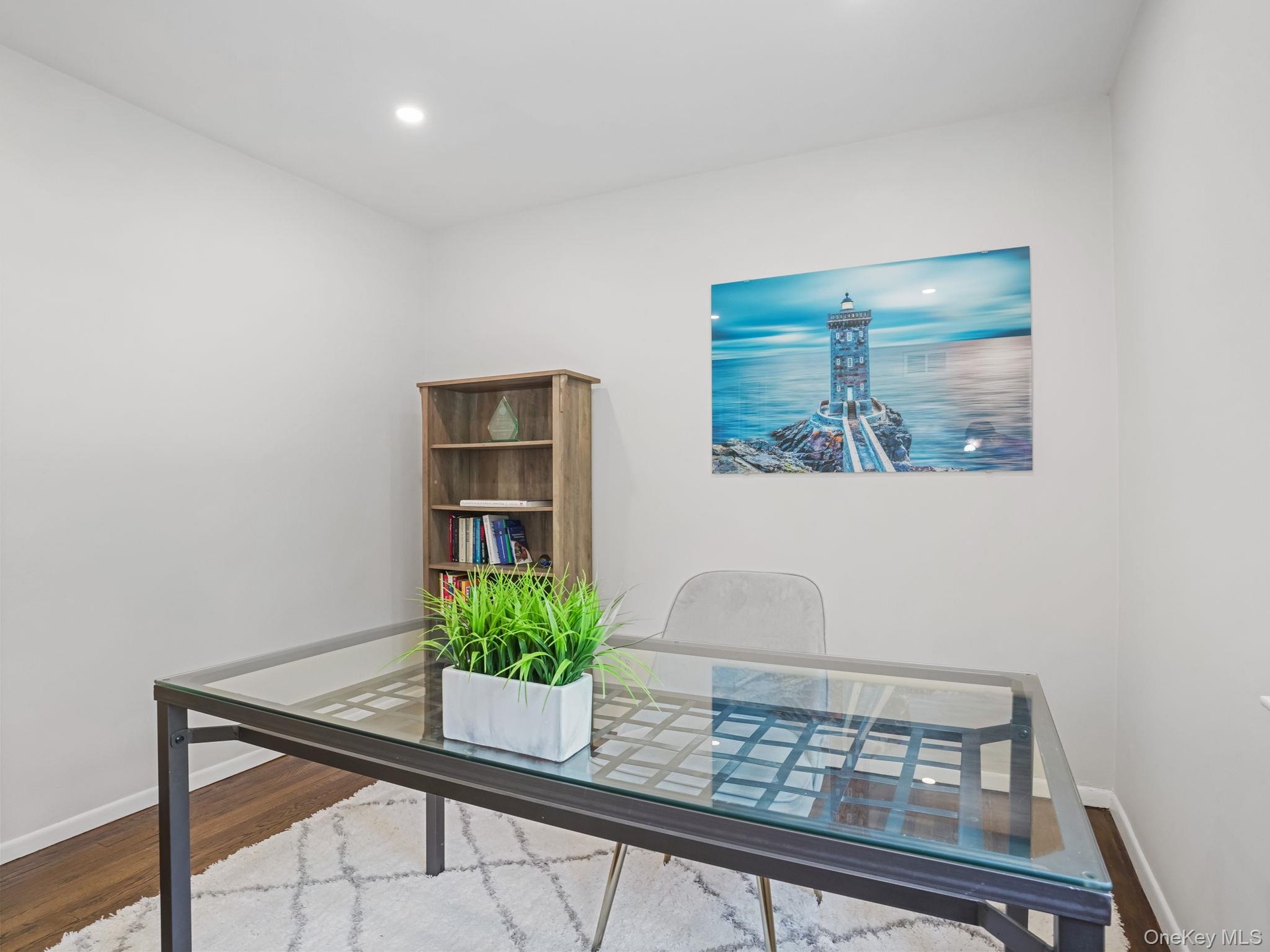 - Living area with dark wood-style floors, crown molding, and recessed lighting