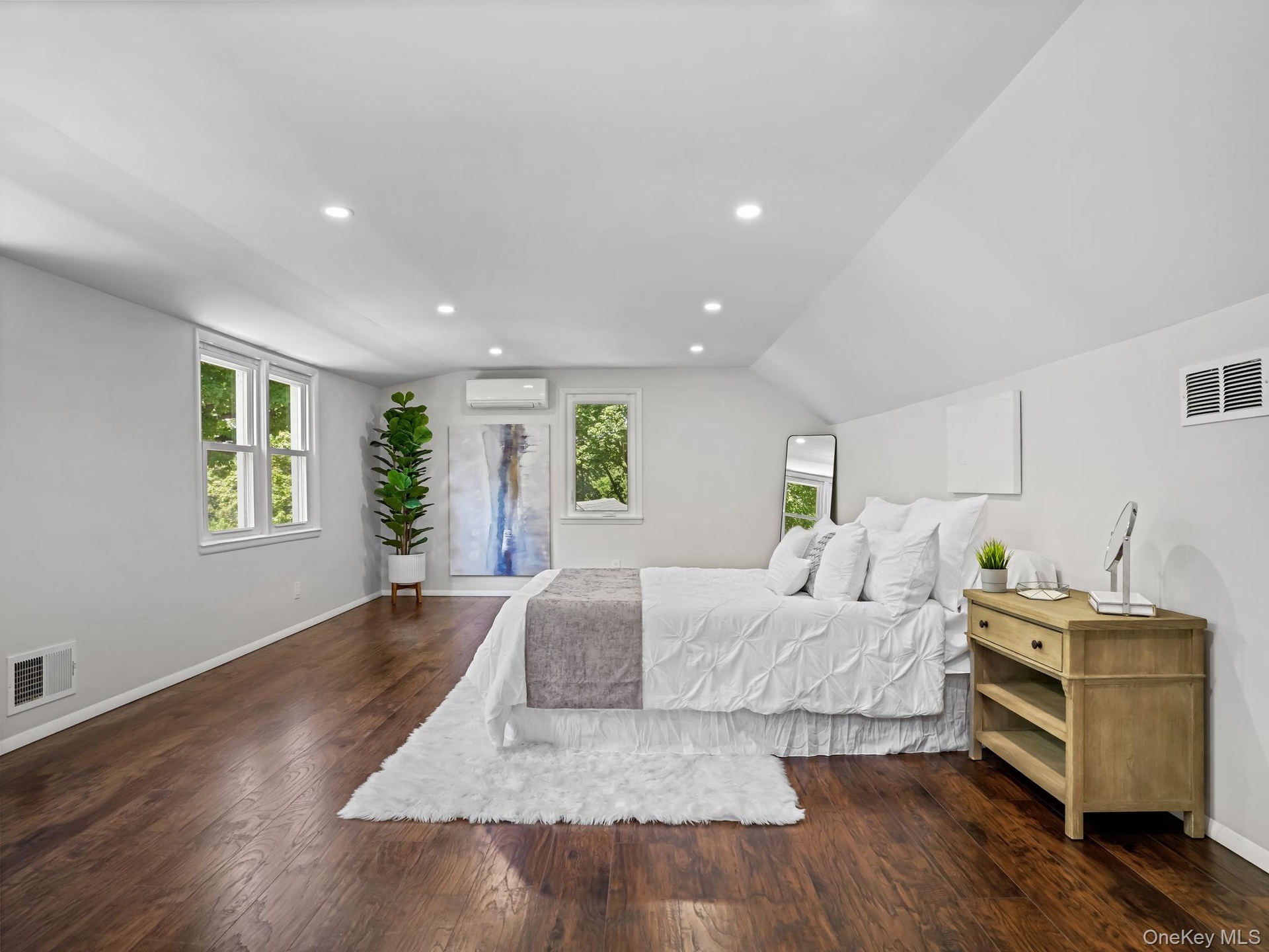 - Bedroom with recessed lighting, lofted ceiling, multiple windows, dark wood-type flooring, and a wall mounted air conditioner