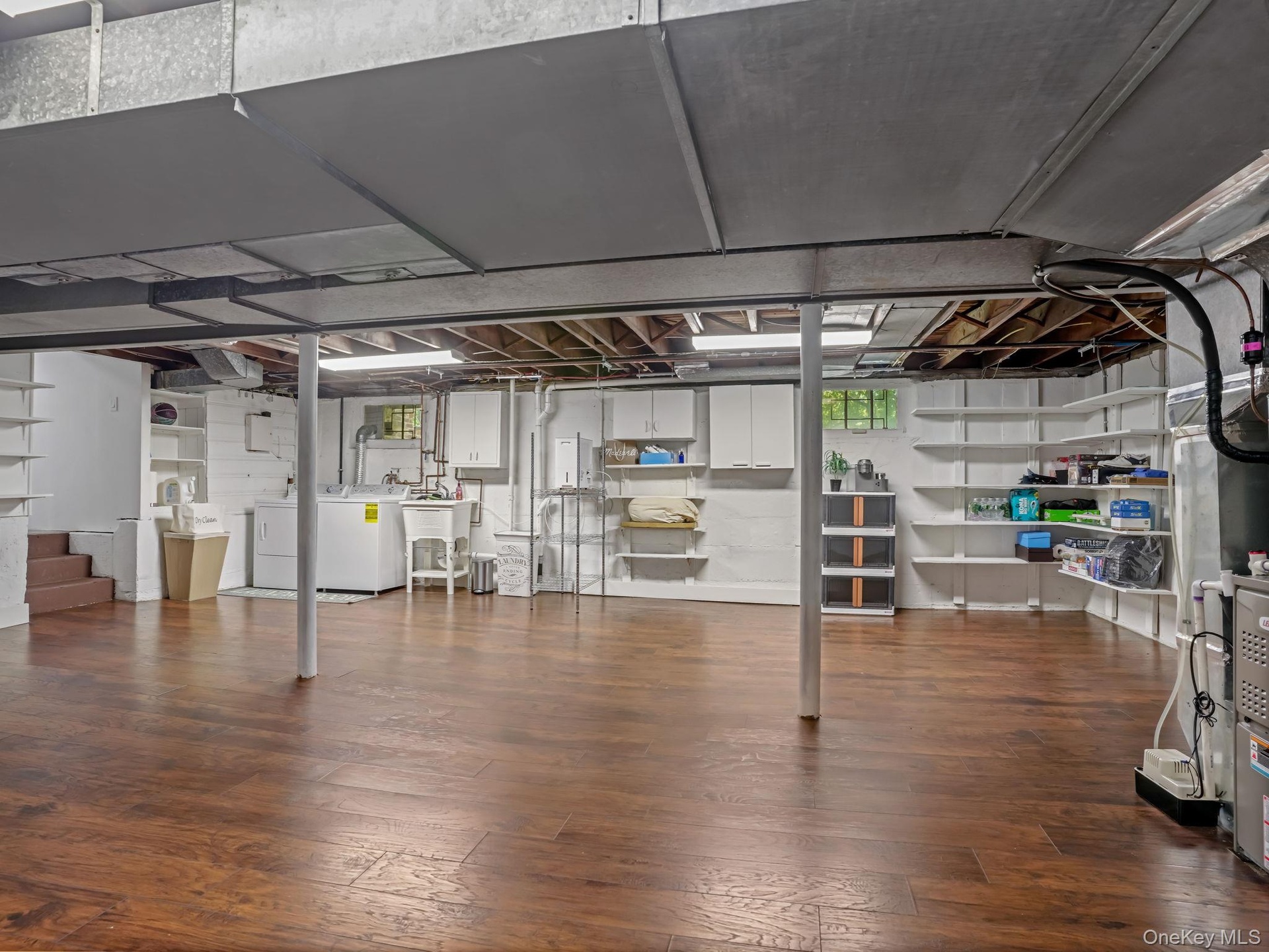 - Below grade area featuring dark wood finished floors, washer and dryer, and stairs