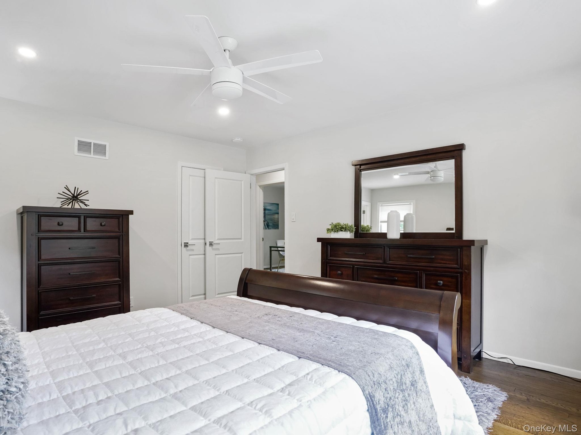 - Bedroom with dark wood-type flooring, recessed lighting, and a ceiling fan
