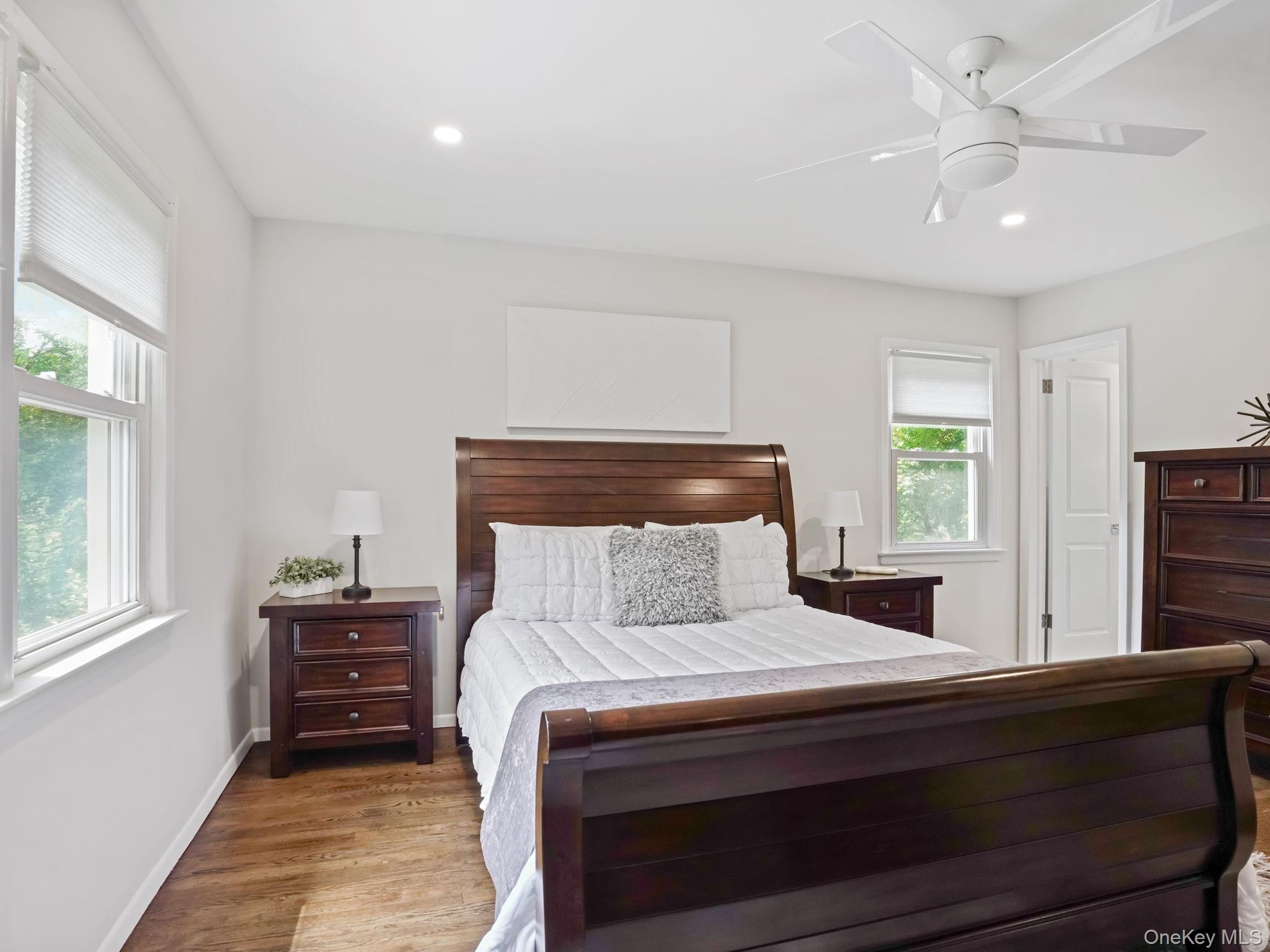 - Bedroom featuring wood finished floors, a ceiling fan, and recessed lighting