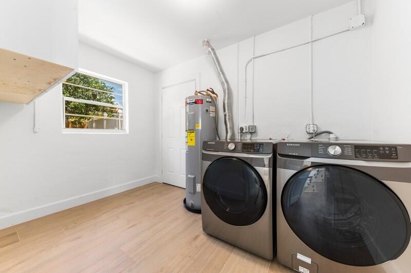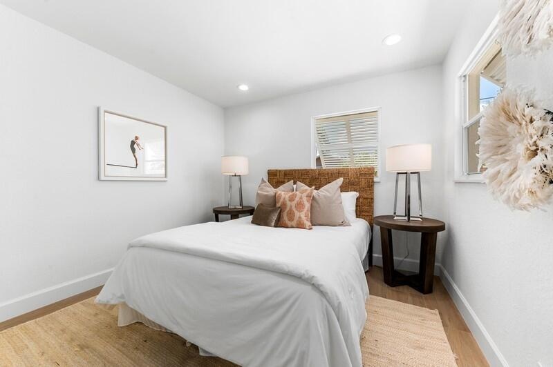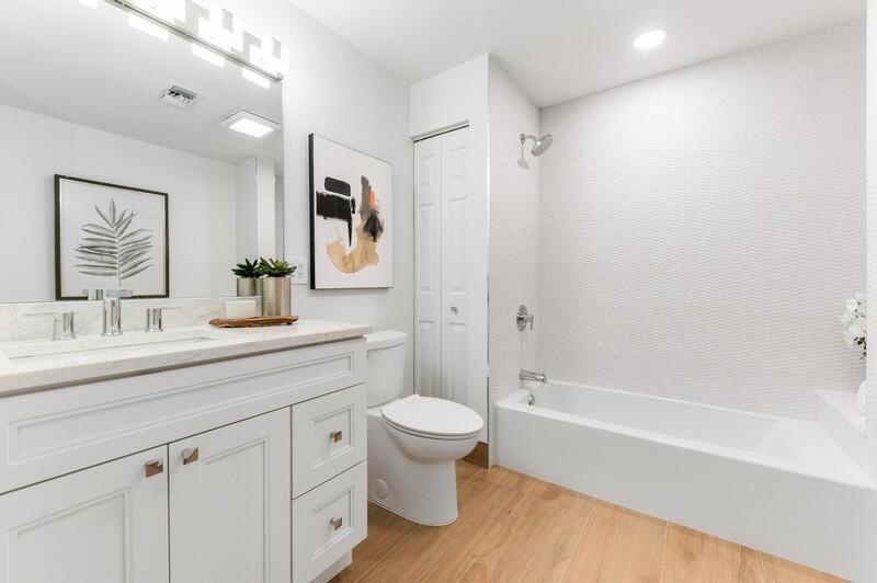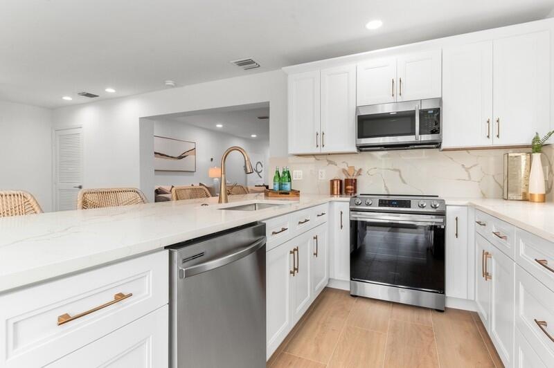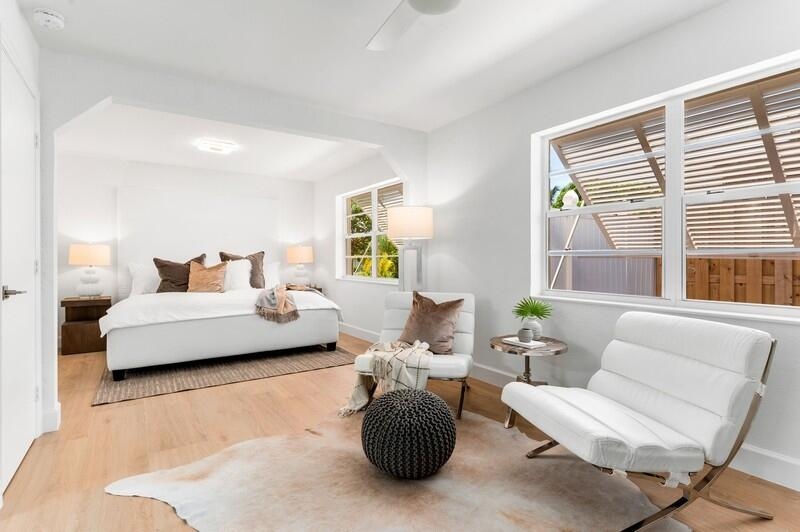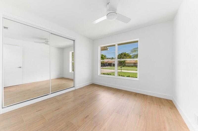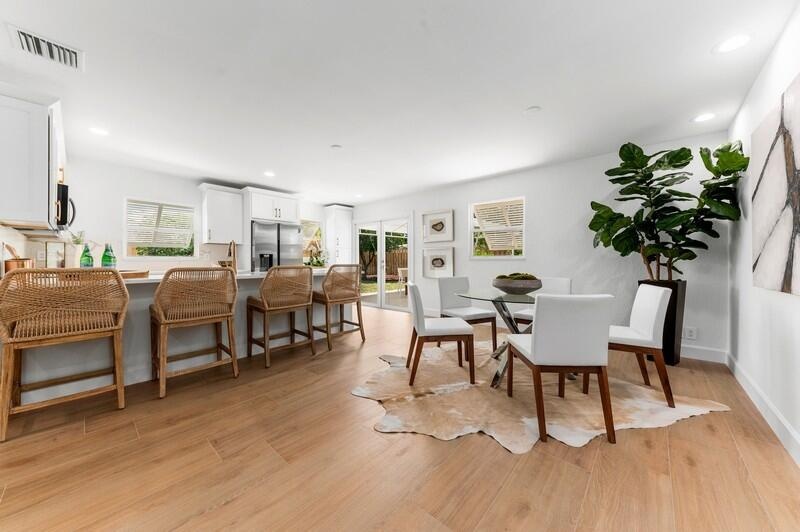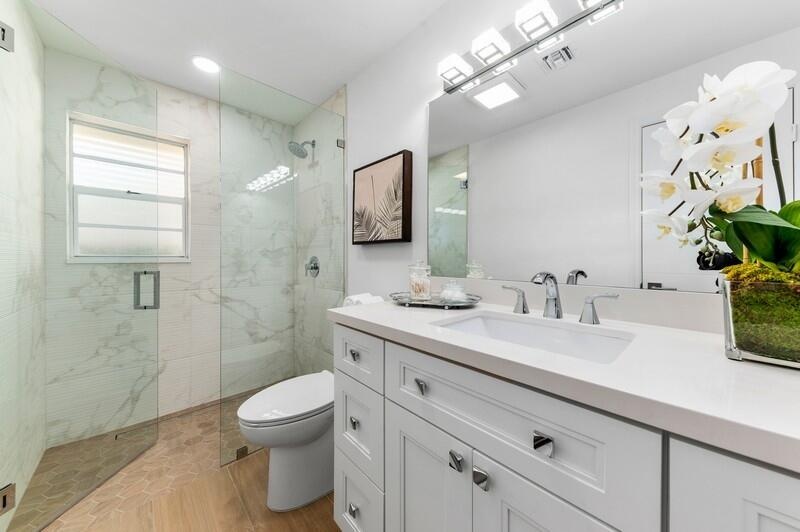 This stunningly remodeled 3br/2ba East Delray heated pool home truly has it all. Gorgeous wood grain porcelain tiles run throughout the home. The open, eat-in kitchen was completely reimagined with custom white shaker cabinetry, Calacutta quartz countertops and backsplash, high-end appliances, and designer hardware. The master suite boasts a separate sitting area and bath with fluted marble veined Italian porcelain tile, custom white shaker vanity with quartz countertop, and high-end polished chrome hardware. The spacious guest rooms enjoy walk-in closets and bountiful natural light. The stunning, oversized secondary bathroom includes a textured porcelain tile bath and custom wood shaker vanity with quartz countertops and chrome hardware. Additional whole-house upgrades include a new Nest