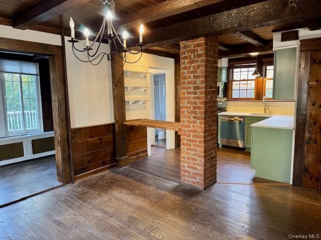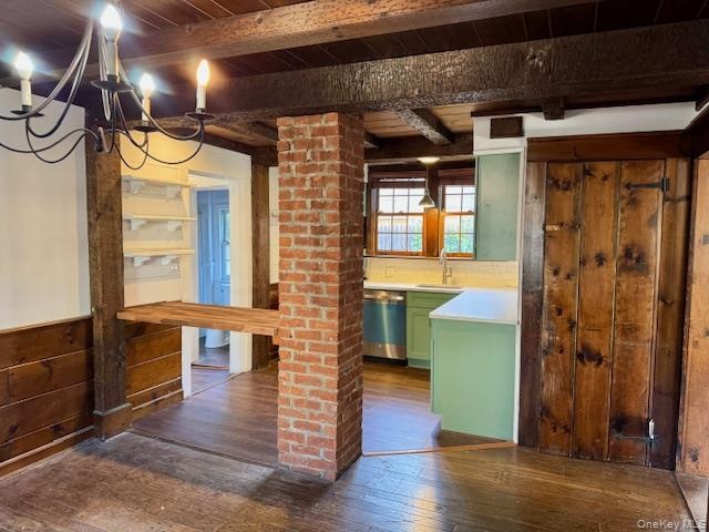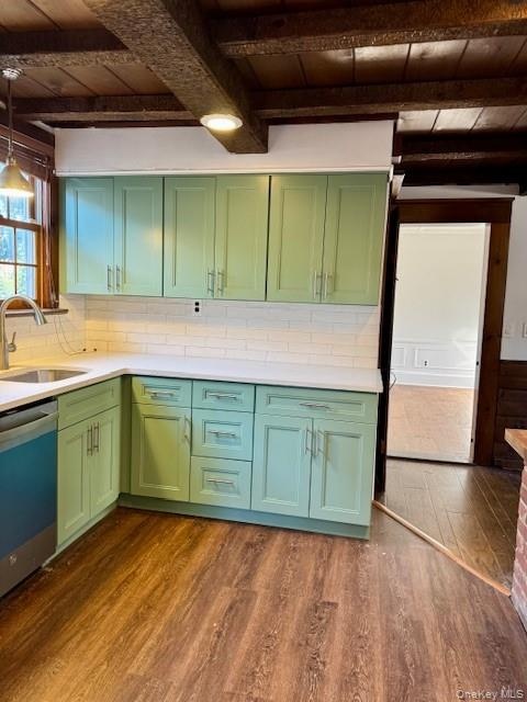 - Kitchen with green cabinets, dark wood finished floors, backsplash, dishwasher, and a wooden ceiling with exposed beams