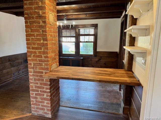 - Unfurnished dining area with wainscoting, beamed ceiling, wooden walls, dark wood-style floors, and a chandelier