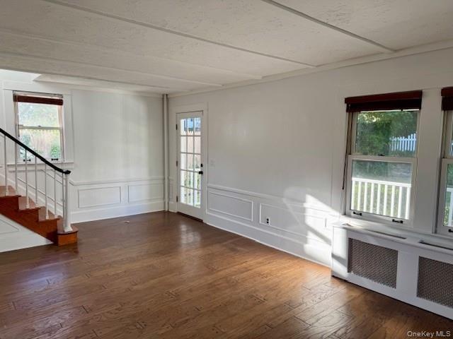 - Living Room featuring radiator heating unit, a decorative wall, stairs, dark wood finished floors, and wainscoting