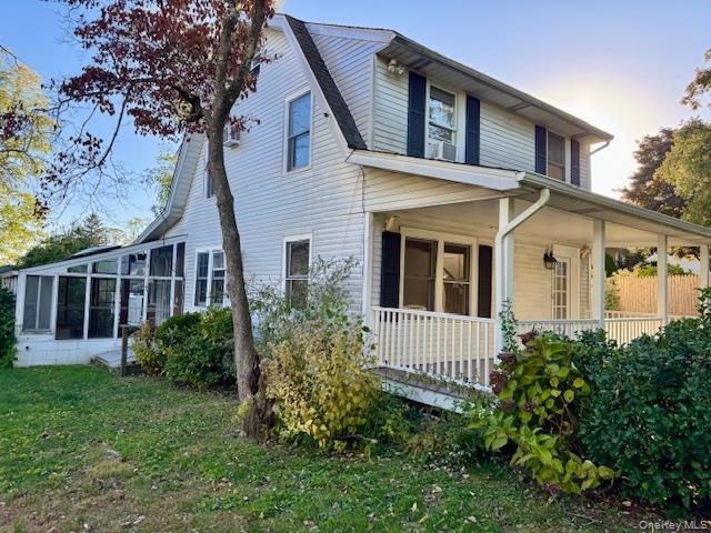 - View of property exterior featuring a yard, a sunroom, and covered porch