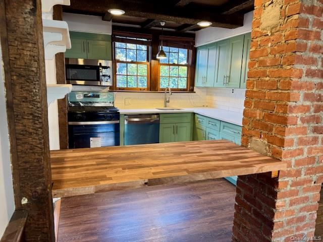 - Kitchen featuring green cabinetry, butcher block countertops, appliances with stainless steel finishes, decorative light fixtures, and backsplash