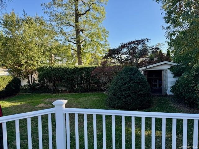 - View of grassy yard with a deck