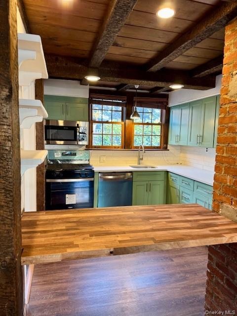 - Kitchen featuring green cabinetry, appliances with stainless steel finishes, a wood ceiling with exposed beams, decorative light fixtures, and tastefu