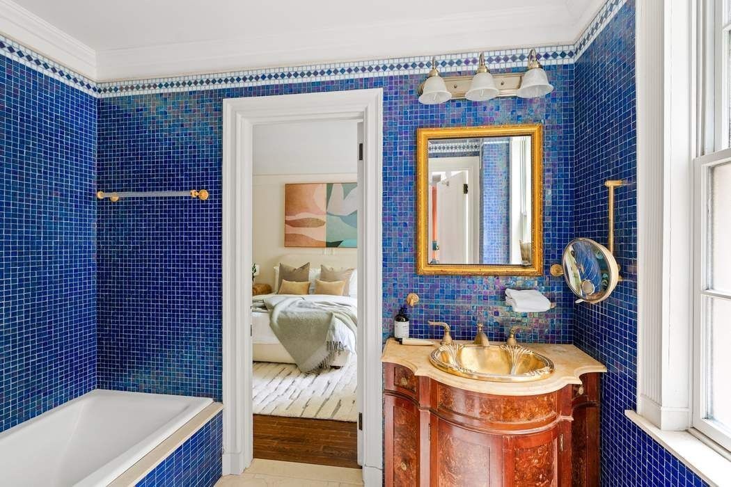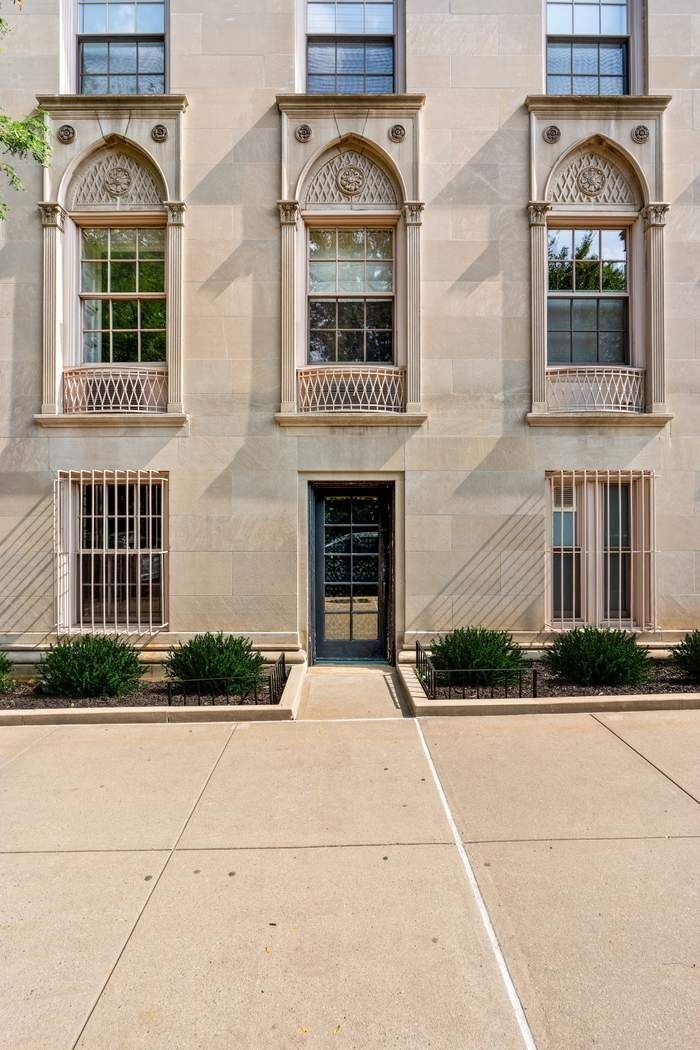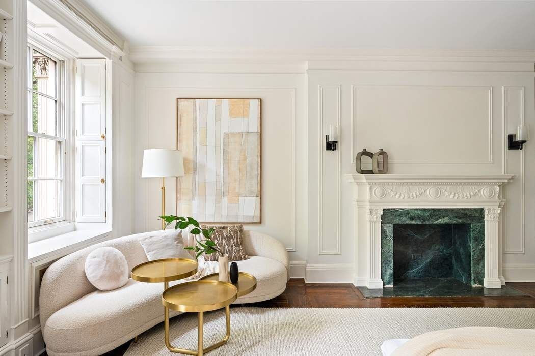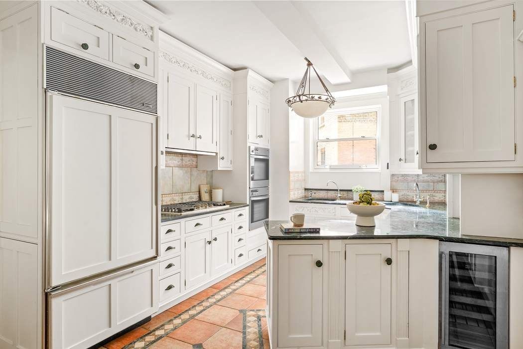 The formal entrance on Riverside opens to a gracious marble-floored foyer that evokes the entrance to a Gilded Age mansion. Finished in Venetian plaster and flanked by two large coat closets, the foyer opens to a sequence of oversized living spaces that comprise the home’s living and entertaining level. French doors open to the Riverside-facing living room, appointed with a decorative fireplace, ornate moldings, and built-in cabinetry with black granite surfaces. The adjacent formal dining room overlooks the landscaped courtyard and can host gatherings on a grand scale. A central gallery with a stained-glass ceiling and granite bar offers an additional entertaining space, complete with a walk-in closet and 146-bottle Sub-Zero wine refrigerator. This level also includes a quiet home office or fourth bedroom with additional refrigerated wine storage and a spacious eat-in kitchen, both facing the quiet planted courtyard. The Kitchen features granite counters, Sub-Zero refrigerator, a five-burner cooktop with double wall ovens, and two sinks.
