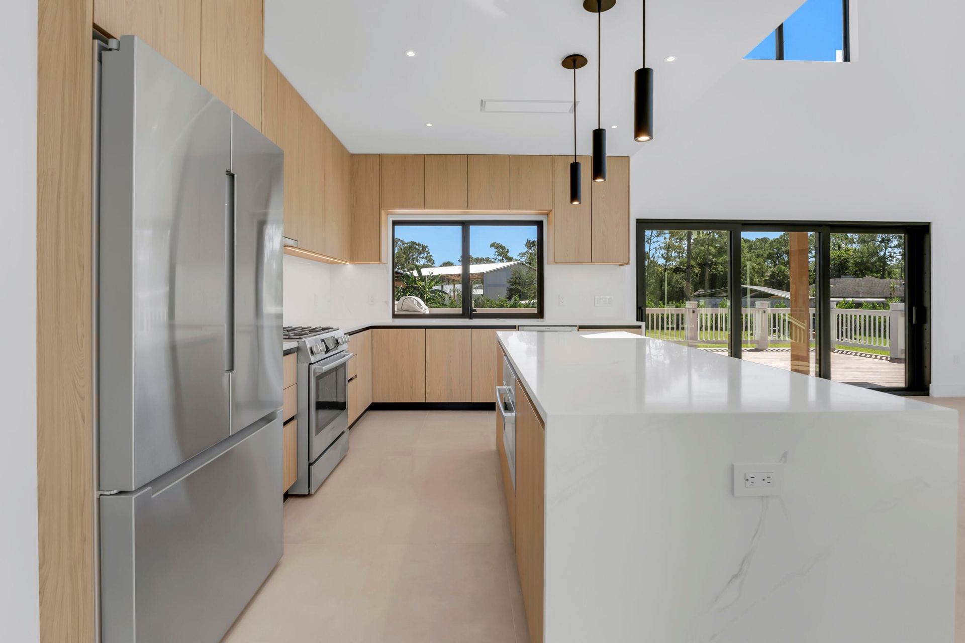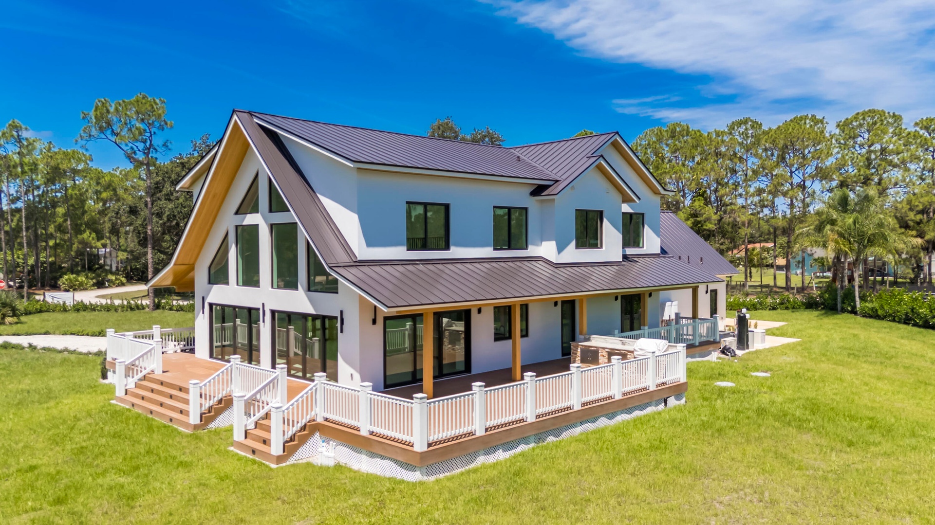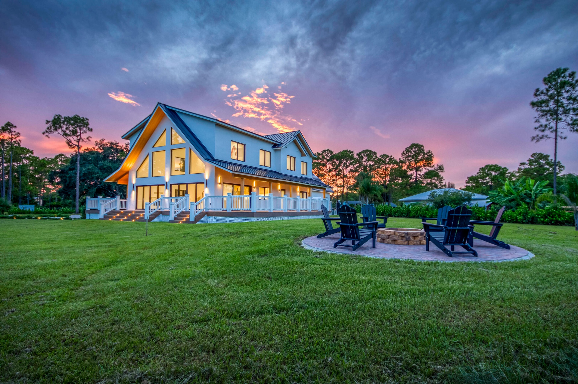 Welcome to a stunning fusion of modern luxury and farmhouse charm, nestled in the heart of Jupiter Farms. Designed by award-winning Wandrian Studios, this brand-new, two-story concrete block estate redefines Florida living with elevated design, high-end finishes, and a seamless indoor-outdoor lifestyle--all set on a fully irrigated 1.31-acre lot with no HOA.Step inside 3,600+ square feet of thoughtfully crafted space featuring five spacious bedrooms, four full bathrooms, and a versatile loft. Monolithic Bellevue porcelain tile flows throughout the home, creating a sleek, cohesive backdrop to the Italian-inspired chef's kitchen with premium Bosch appliances. The centerpiece living room is anchored by a breathtaking two-story A-frame window, flooding the interior with natural light