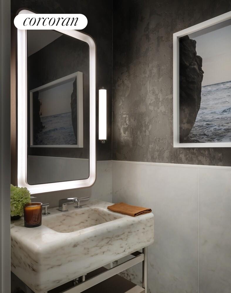 The primary bathroom offers a custom Thomas Juul Hansen designed white oak vanity with recessed medicine cabinet and integrated facial lighting, Volakas marble counters, flooring and walls, waterworks fixtures in polished chrome, radiant heated flooring, and a Toto wall mounted toilet. An oversized closet can be found in the primary bedroom.