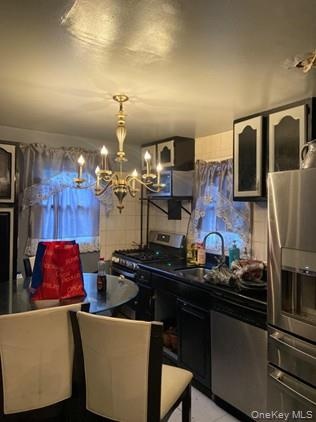 - Kitchen with dark countertops, appliances with stainless steel finishes, dark cabinetry, tasteful backsplash, and pendant lighting