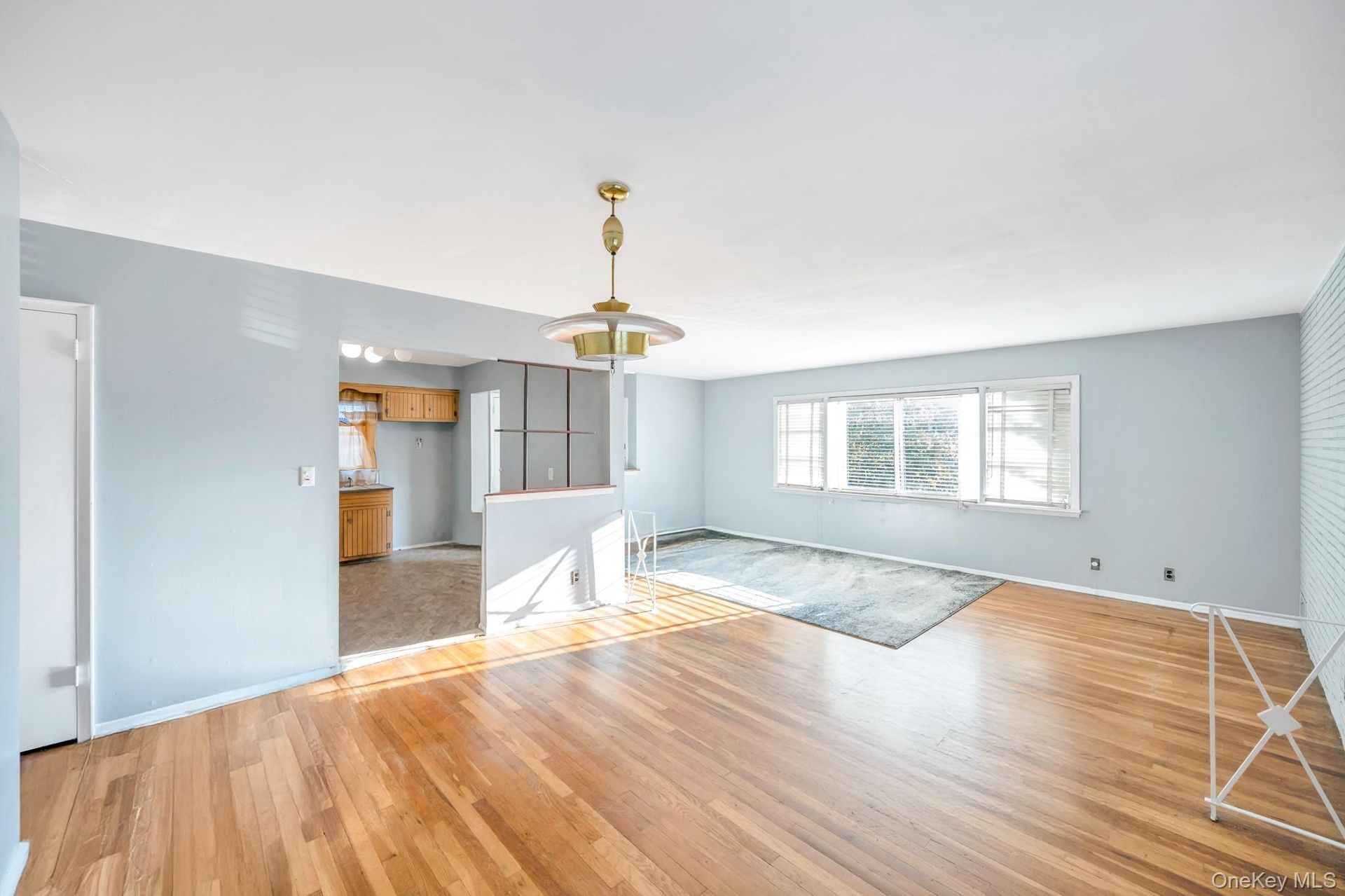 - Unfurnished living room with light wood-type flooring and a chandelier
