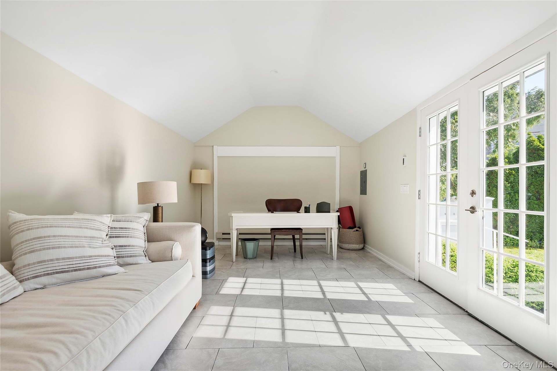 - Living area featuring vaulted ceiling, light tile patterned floors, and french doors