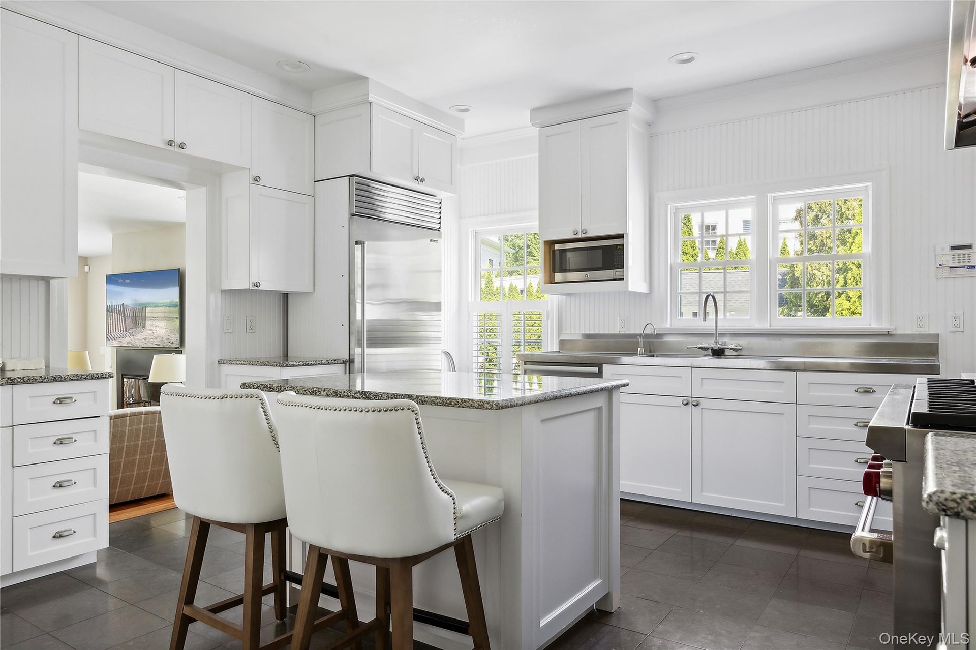 - Kitchen with a breakfast bar, white cabinetry, built in appliances, plenty of natural light, and ornamental molding