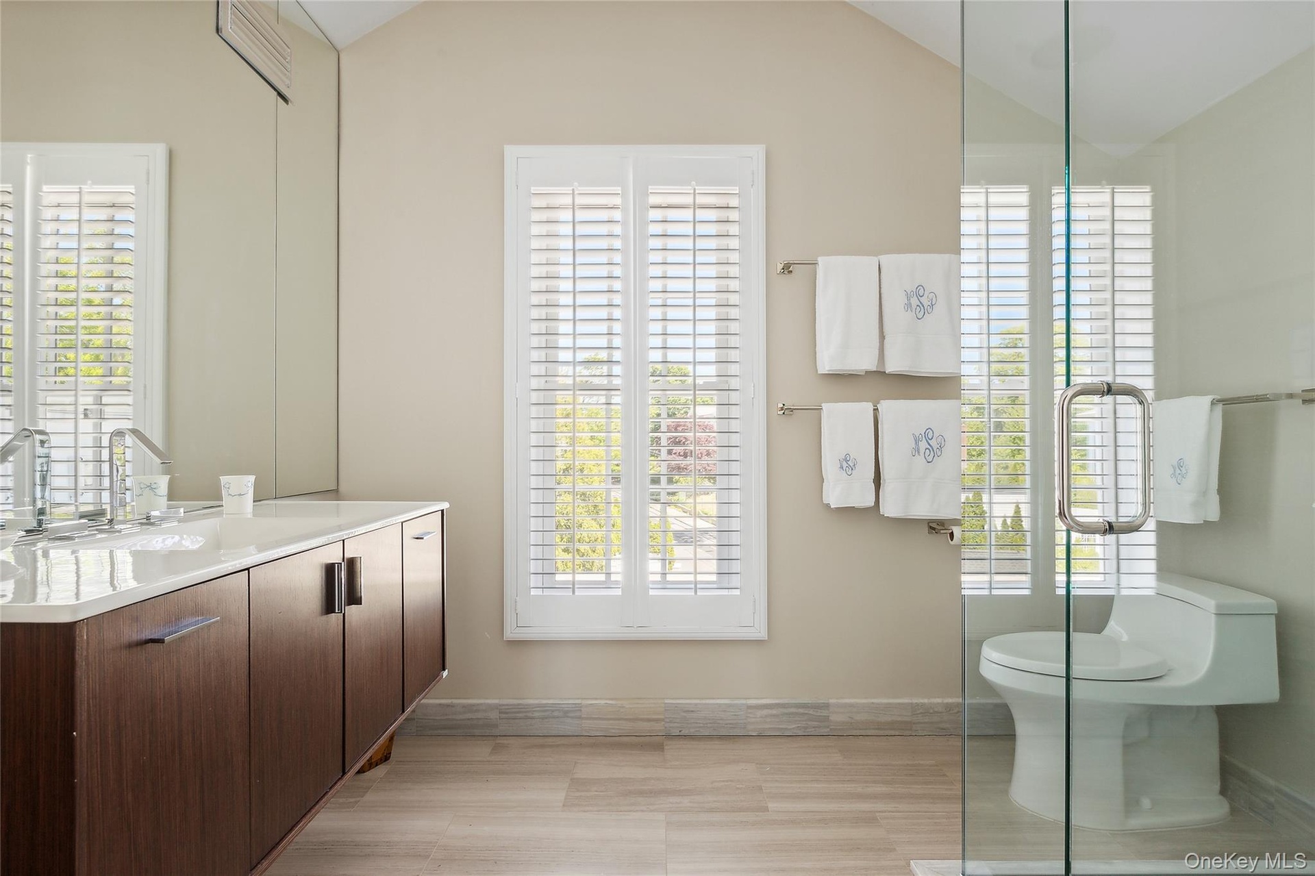- Bathroom with vanity, plenty of natural light, vaulted ceiling, and light wood-style floors