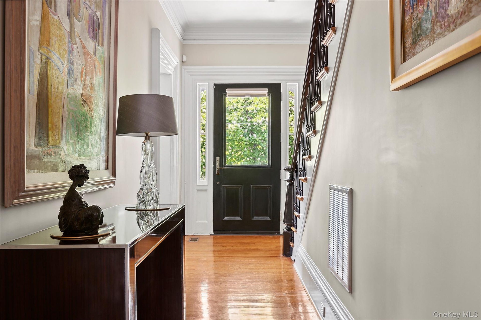 - Entrance foyer featuring ornamental molding, light wood-style floors, and stairway