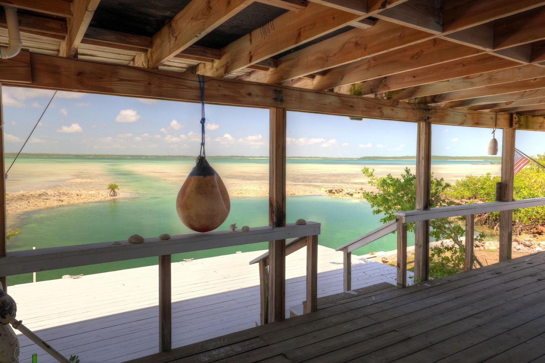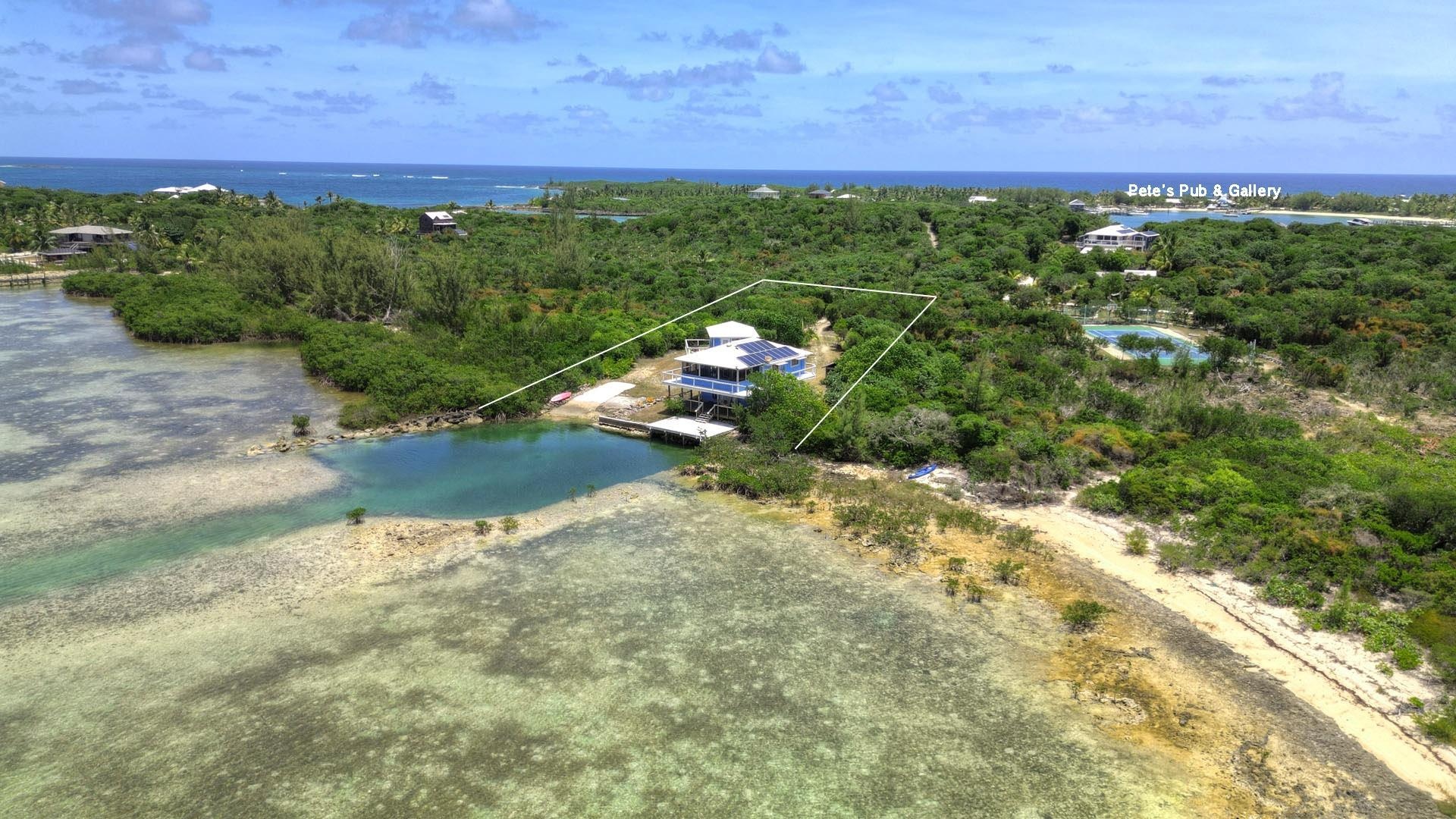 With mesmerizing views of The Bight of Old Robinson, this elevated cozy 2b/2b, pod-style waterfront home in the friendly community of Little Harbour is on the market for the first time ever. Built in 2005 and then expanded in 2015, the estate blends comfort, functionality, and self-sufficiency in a spectacular island setting. 160 feet of shoreline, a small boat ramp & small boat basin at the back door, perfect for outdoor adventures of all kinds. A relaxing paddle or an exciting fly fish hunt to be had where this home overlooks the East Abaco Creeks National park - a haven for birdwatching, marine life, and peaceful paddling adventures. The main part of the home has 1 bdrm & 1 bthrm and comfy screened porch overlooking the sea. The guest bdrm pod has a full bathroom and a built-in kitchenette/wet bar. Offering 1,032 SF of air-conditioned living space over a 700 SF garage and workshop, including furniture and appliances. Construction: concrete slab ground floor, wood frame walls, asphalt roof. 20,000 gallons water storage, 18kw diesel generator, 18 PV panels, 48v Lithium batteries.