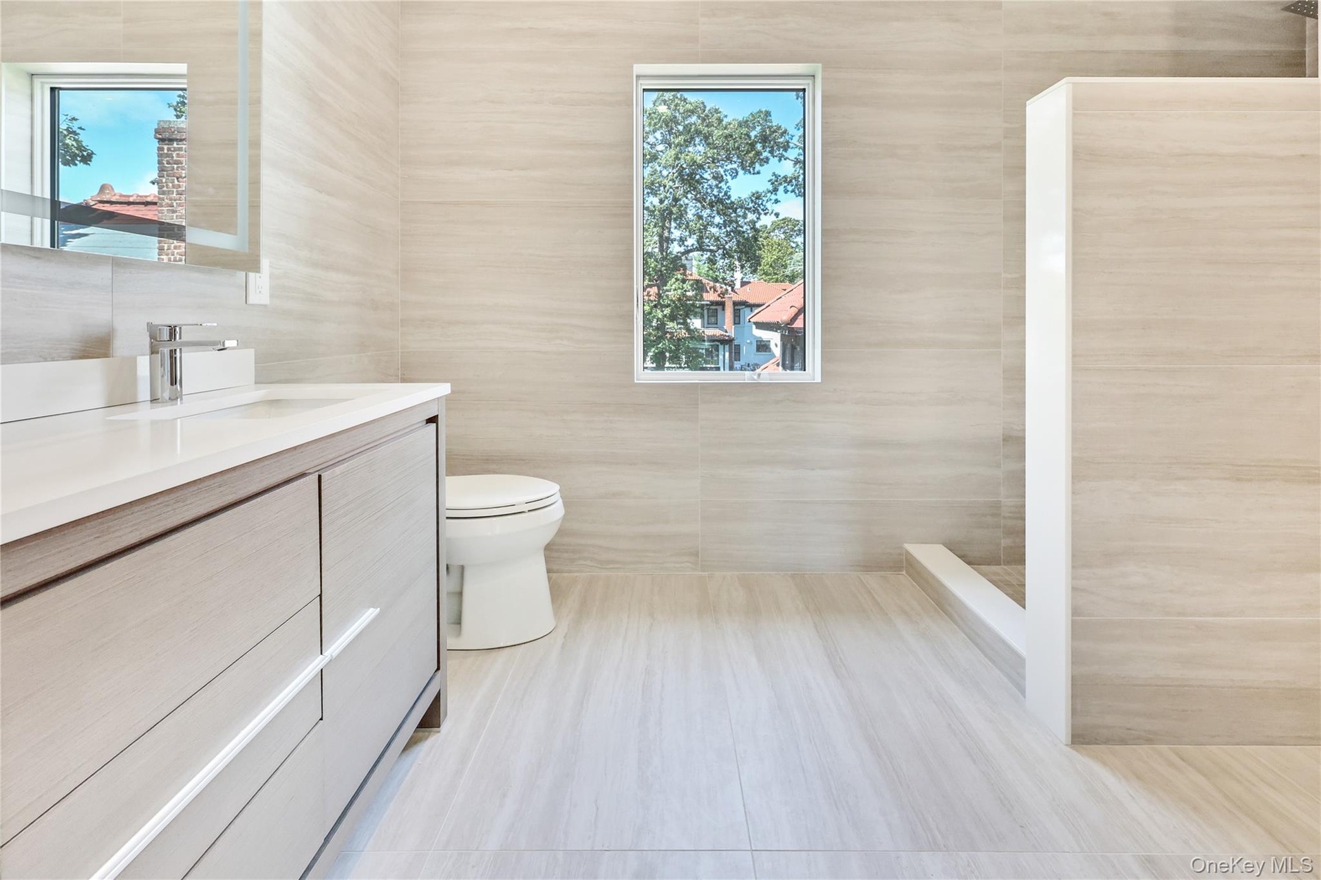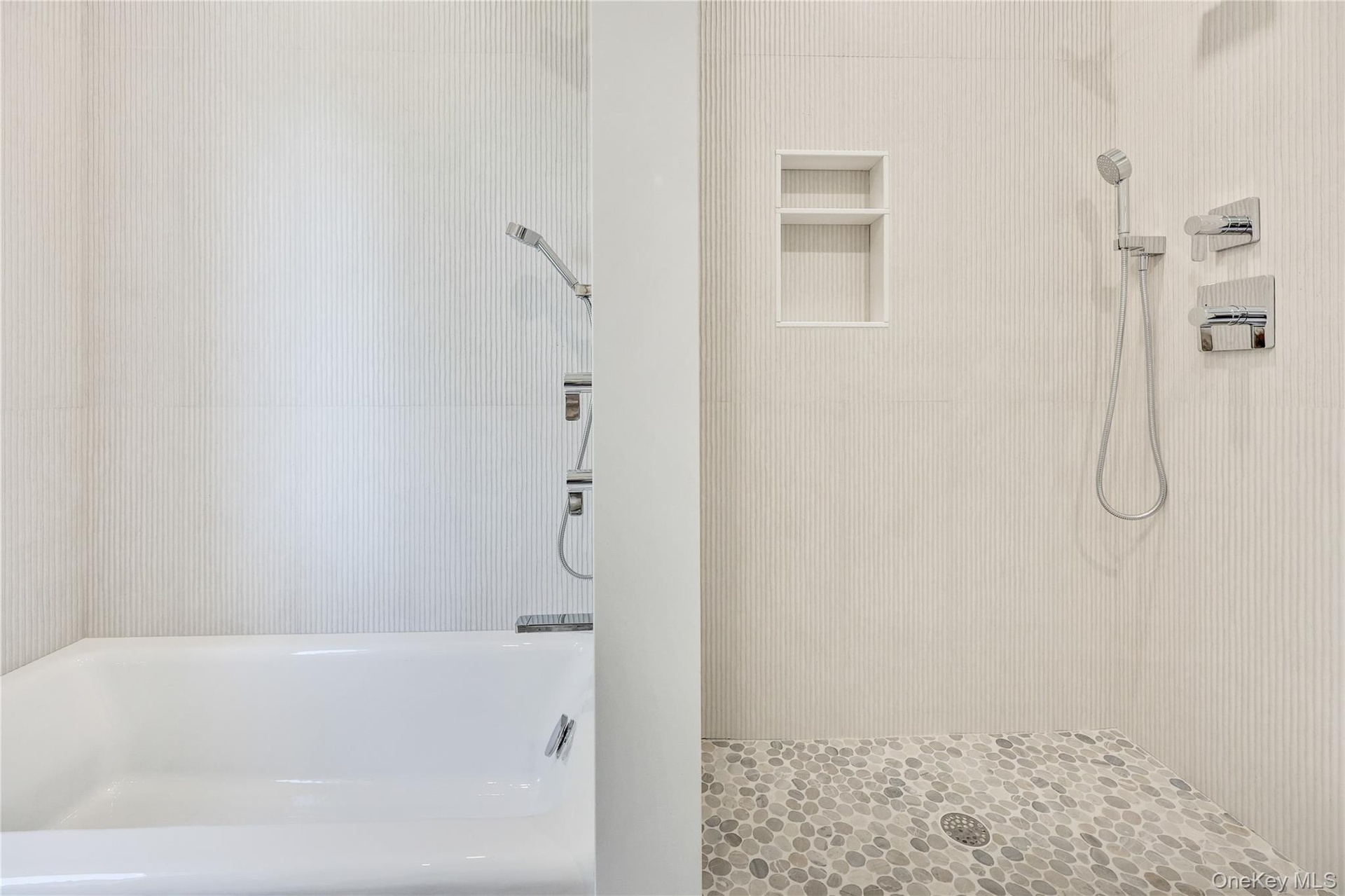 - Bathroom featuring tile walls, a walk in shower, a freestanding bath, and recessed lighting