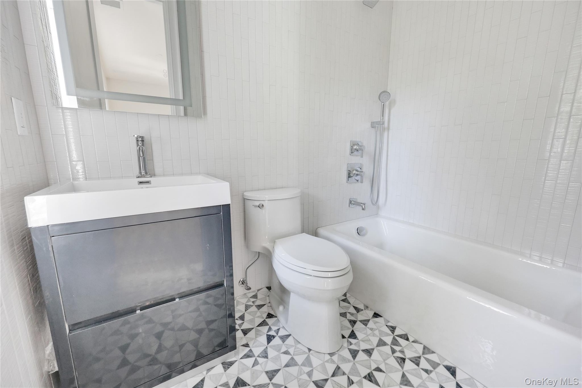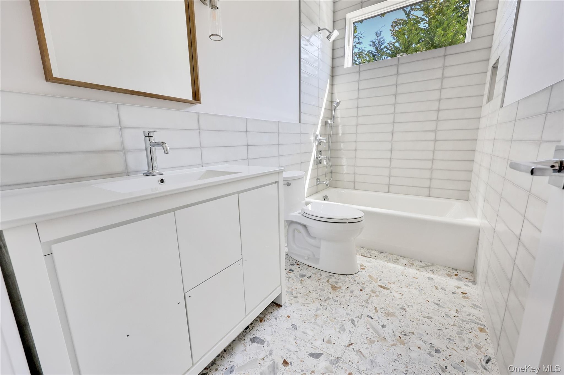 - Full bath with shower / washtub combination, vanity, and tile walls