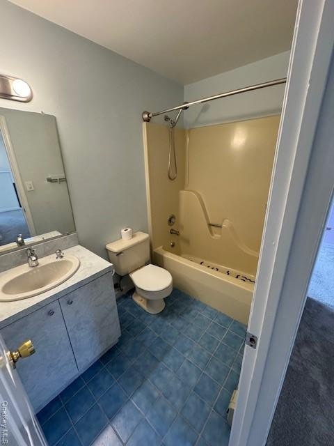 - Full bath with vanity, shower combination, and dark tile patterned flooring