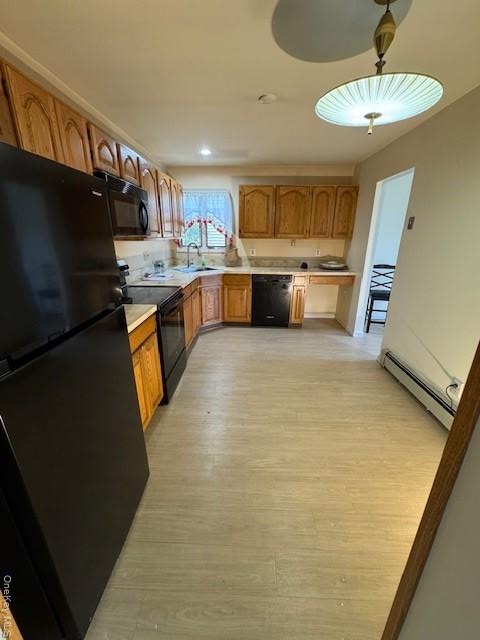 - Kitchen with brown cabinetry, black appliances, light countertops, light wood finished floors, and recessed lighting