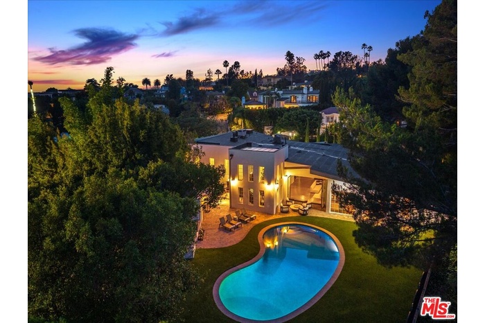 The Weinhart Estate. For the first time in nearly three decades, this rare mid-century jewel comes to market. Set on an elevated corner lot in the tranquil hills above the flats, the home offers the perfect blend of privacy, pedigree, and location. Clean mid-century lines, soaring beamed ceilings, and walls of glass capture panoramic canyon views while seamlessly merging indoor and outdoor living. The residence unfolds with a dramatic pivoting front door, expansive living spaces anchored by a striking stone fireplace, and a 40-foot chef's kitchen outfitted with a 12-foot island, dual Wolf induction ranges, Sub-Zero refrigeration, and book-matched statuary marble. A marble-topped wet bar, sophisticated den, and thoughtfully designed entertaining areas reflect timeless mid-century glamour. Upstairs, the skylit primary suite features a private balcony, marble fireplace, dual walk-in closets, and a spa-like bath. Additional guest suites echo the home's refined aesthetic. Outside, lush landscaping surrounds a Pebble-finish pool, built-in barbecue, and multiple terraces for alfresco dining and lounging. An extraordinary opportunity to own an authentic piece of mid-century style in one of Beverly Hills' most coveted settings just moments from the iconic Beverly Hills Hotel and the world-renowned shops and dining of Rodeo Drive.