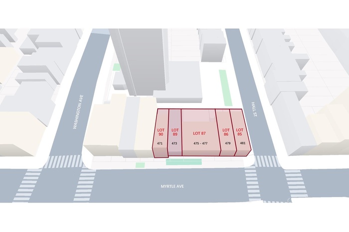 Douglas Elliman, as exclusive agent, is thrilled to offer for sale an INCREDIBLE DEVELOPMENT OPPORTUNITY; In offering the assemblage of 471, 473, 475-477, 479 and 481 Myrtle Avenue, Clinton Hill Brooklyn. These Five buildings represent a large contiguous offering (all same ownership) to develop a singular 9 story property along Myrtle Avenue cornering on Hall Street in the prime Clinton Hill neighborhood of Brooklyn. This presents a development opportunity to construct a 9-story mixed use of approximately 60,000 +/- Gross SF property (including cellar) of residential with ground floor retail space. The Property is located within one block of Pratt Institute of Technology. This is a rare opportunity to develop a newly constructed mixed-use property to high standards. The property is partially tenanted with residential and retail space. There is current reoccurring income until development plans are in place. Setup available upon request.