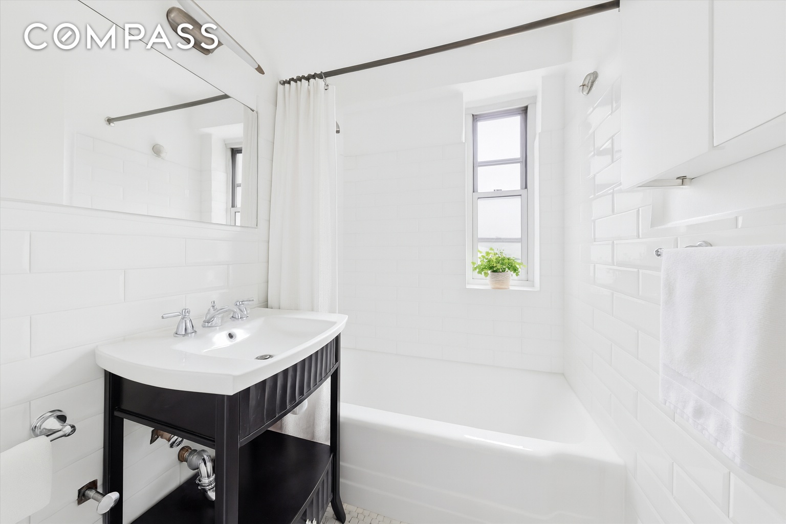 Both bedrooms are generously proportioned and can easily accommodate king or queen-sized beds. The windowed bathroom is tastefully updated with large-format white subway tiles and a mocha-toned vanity.