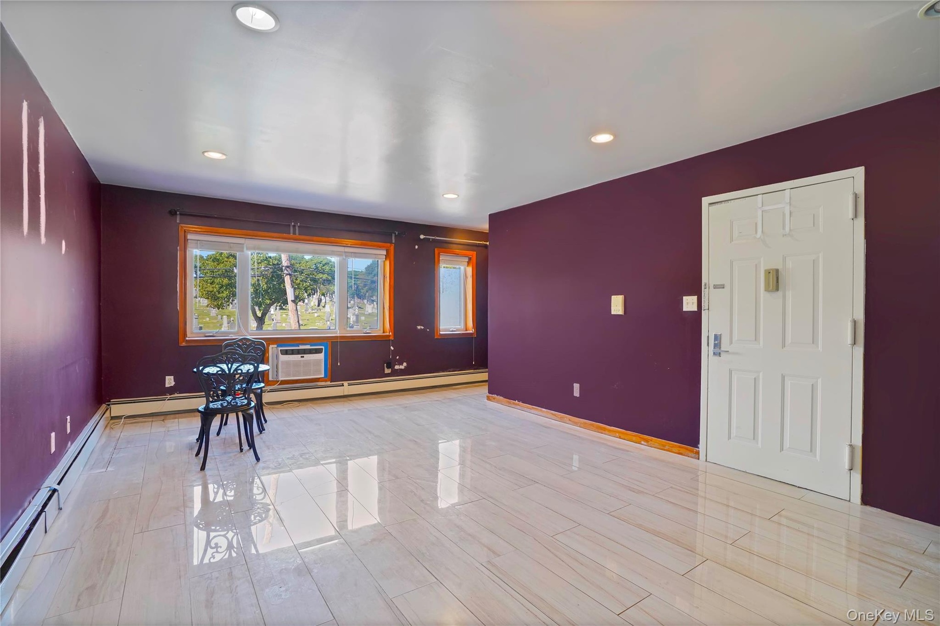 - Empty room with baseboard heating, light wood-type flooring, and a wall mounted air conditioner