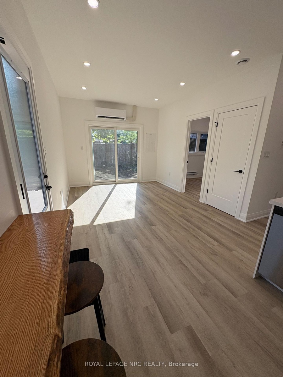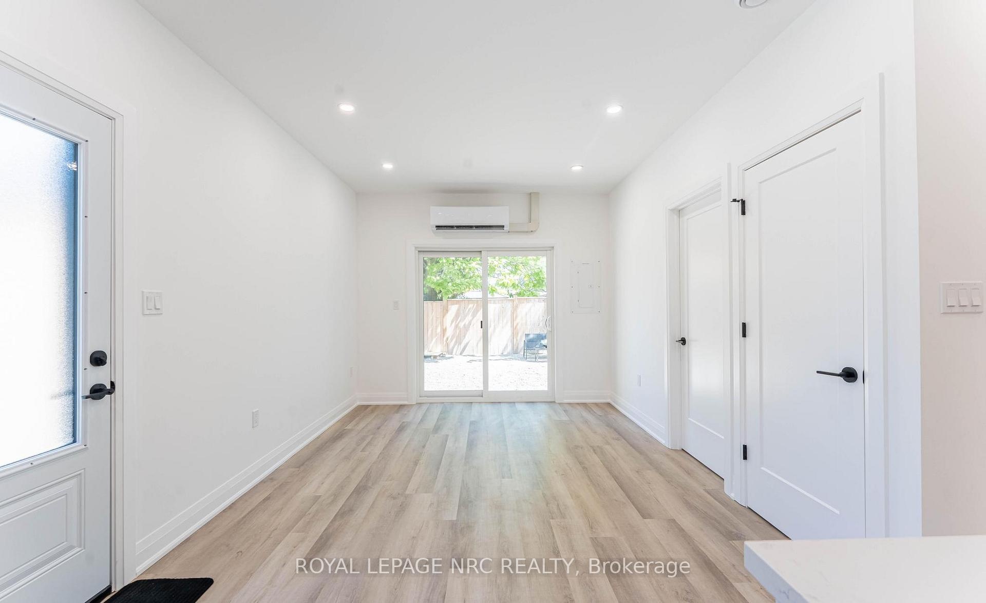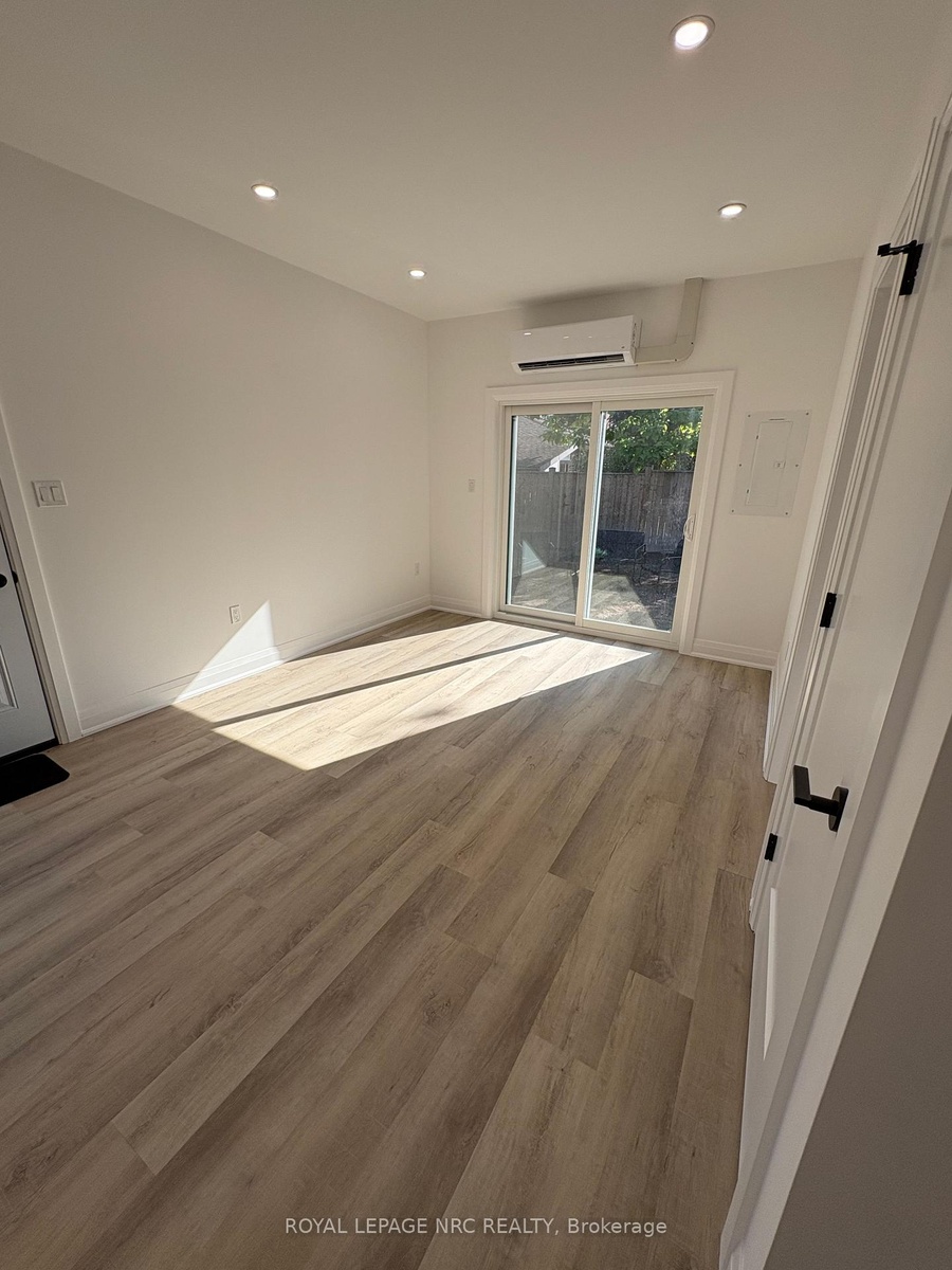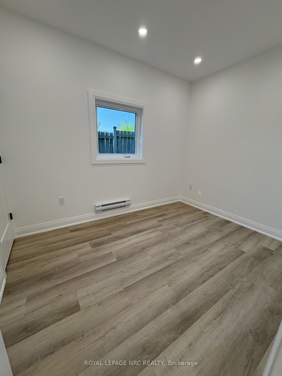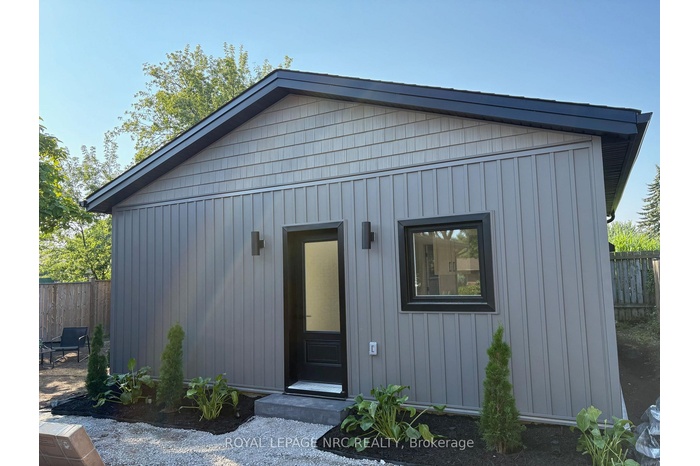 Stunning newly built 2 bedroom, 1 bathroom unit in the north end of St Catharines within walking distance to the canal and shopping. This smart layout maximizes space, making it ideal for two people. Open concept living/dining room/kitchen with vinyl flooring and LED pot lights. The kitchen offers white cabinets and stainless steel appliances with separate counter space. Two bedrooms, beautiful 4-pc bath and stackable washer & dryer in laundry closet finish this space. Sliding patio doors access private fenced yard with patio set with a bonus storage shed that could easily be used as man cave or she shed. Beautifully landscaped low maintenance yard with no grass to cut. Included in lease; washer, dryer, dishwasher, fridge, stove, air purification system, water heater, heat pump/AC and baseboard heating. Vacant for immediate possession.