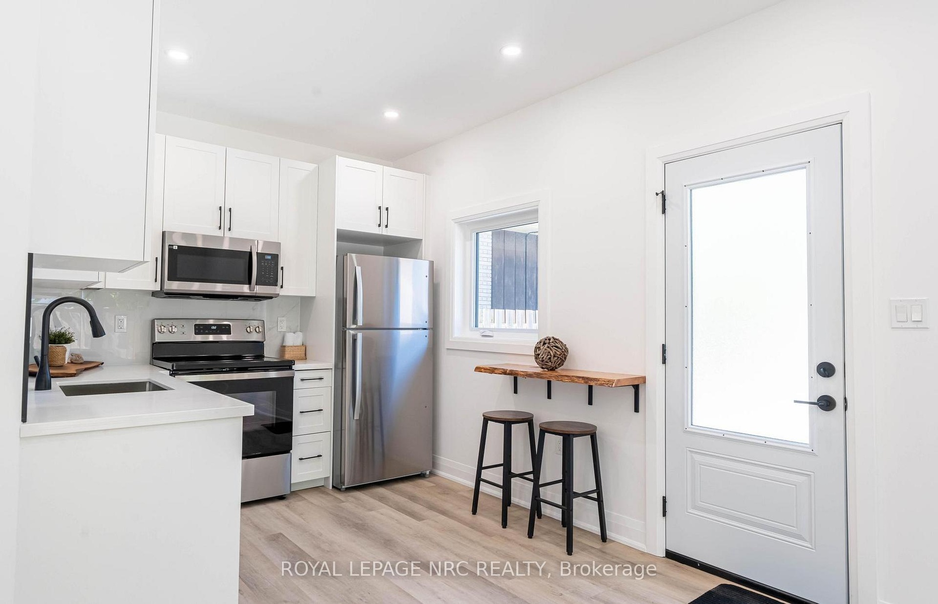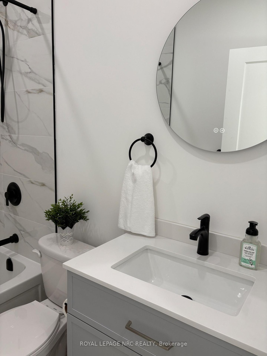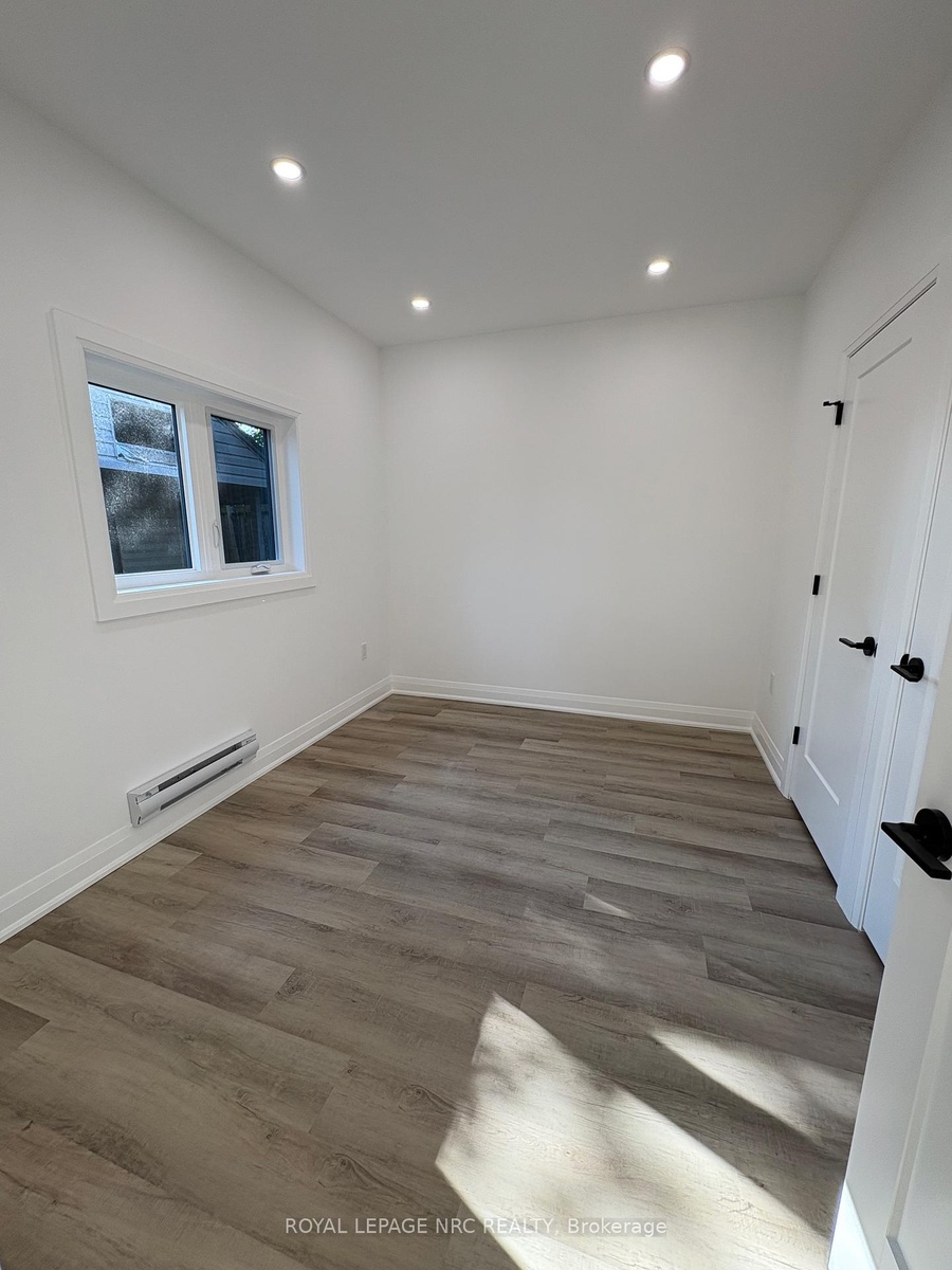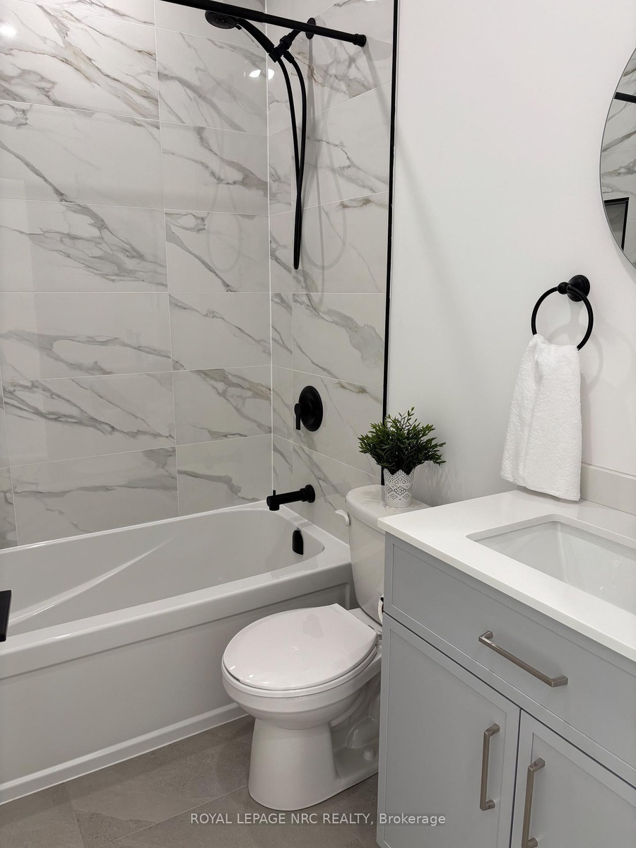 Stunning newly built 2 bedroom, 1 bathroom unit in the north end of St Catharines within walking distance to the canal and shopping. This smart layout maximizes space, making it ideal for two people. Open concept living/dining room/kitchen with vinyl flooring and LED pot lights. The kitchen offers white cabinets and stainless steel appliances with separate counter space. Two bedrooms, beautiful 4-pc bath and stackable washer & dryer in laundry closet finish this space. Sliding patio doors access private fenced yard with patio set with a bonus storage shed that could easily be used as man cave or she shed. Beautifully landscaped low maintenance yard with no grass to cut. Included in lease; washer, dryer, dishwasher, fridge, stove, air purification system, water heater, heat pump/AC and baseboard heating. Vacant for immediate possession.