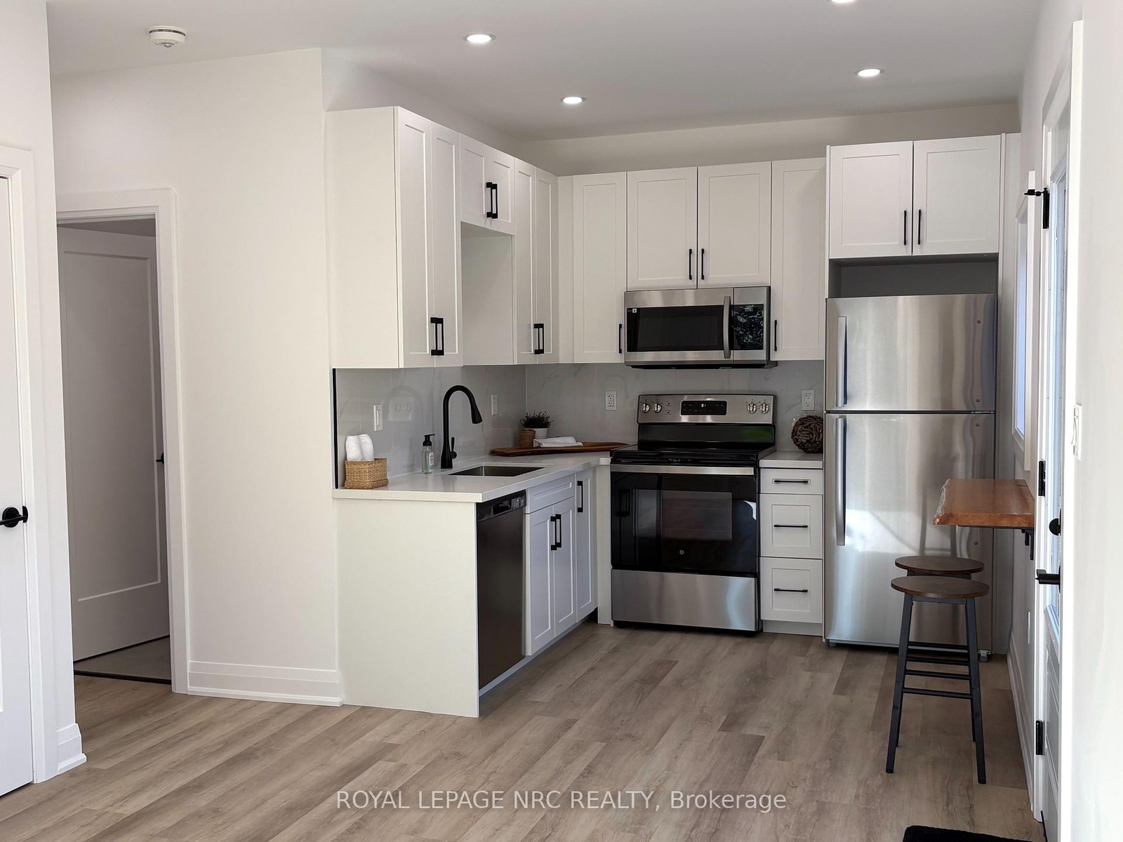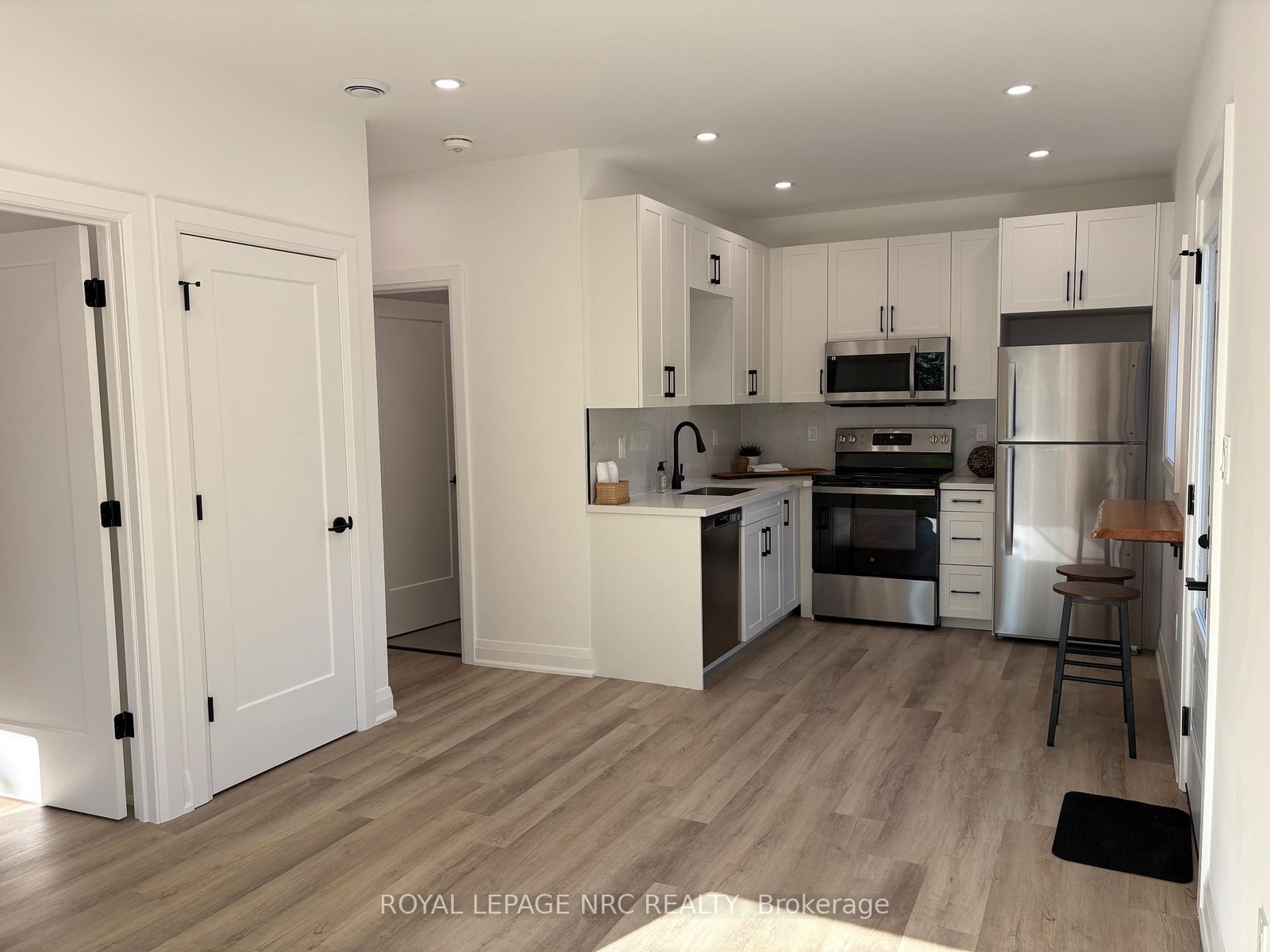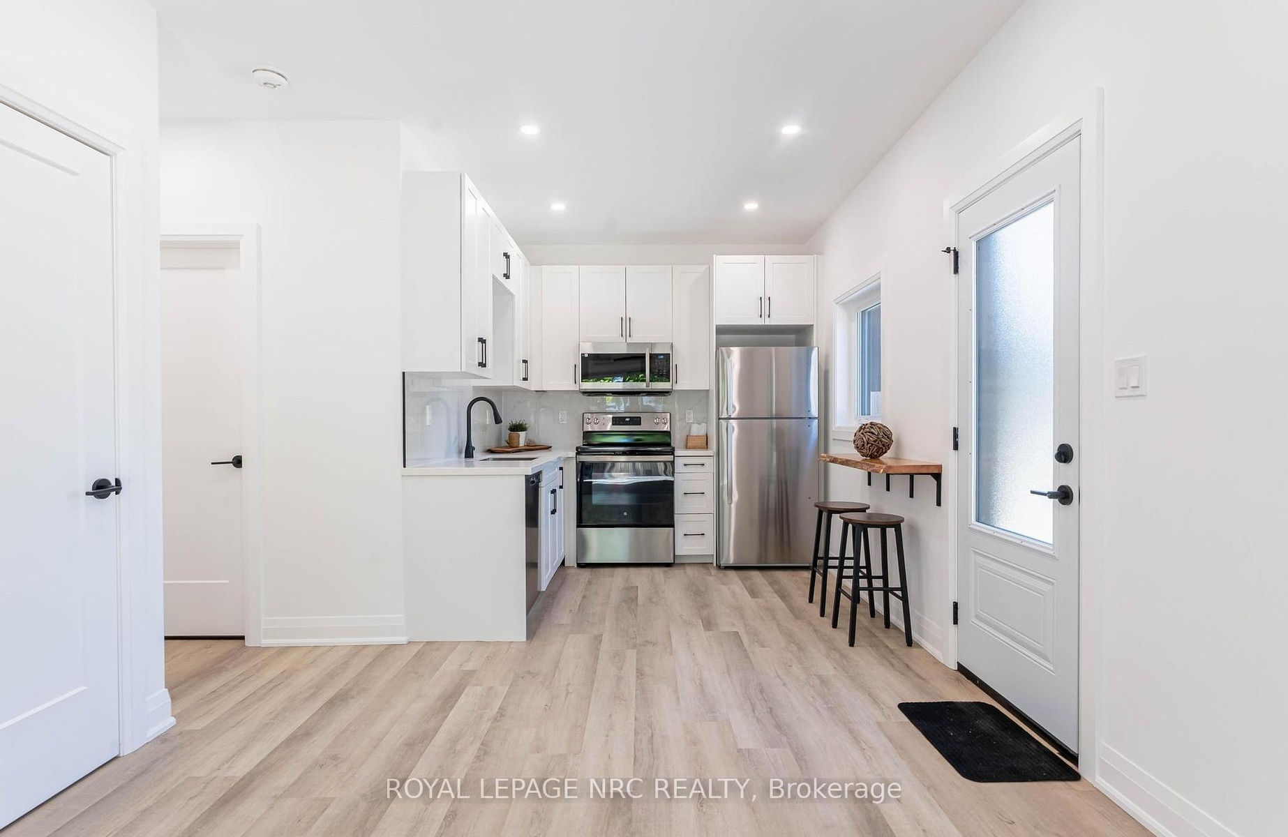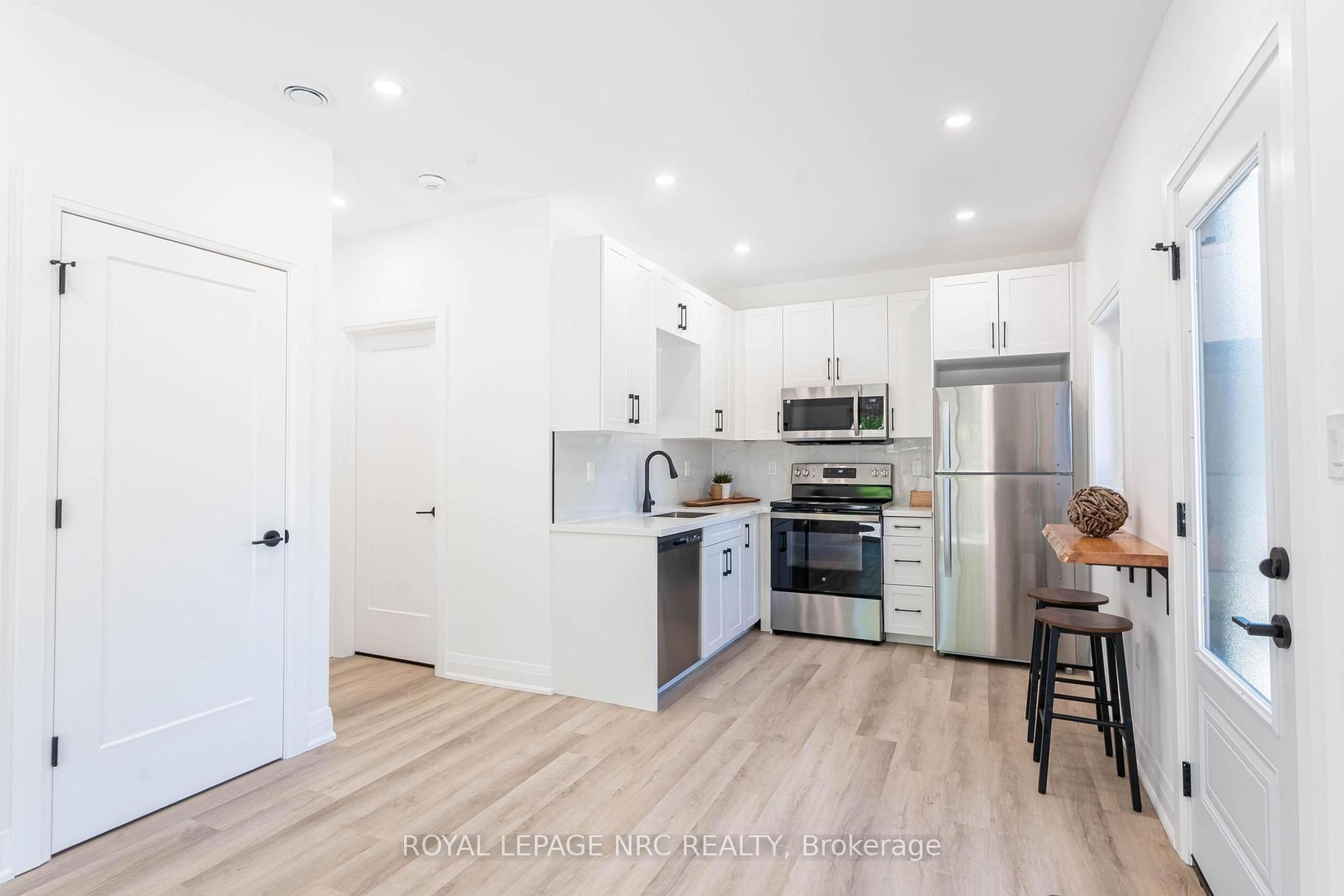 Stunning newly built 2 bedroom, 1 bathroom unit in the north end of St Catharines within walking distance to the canal and shopping. This smart layout maximizes space, making it ideal for two people. Open concept living/dining room/kitchen with vinyl flooring and LED pot lights. The kitchen offers white cabinets and stainless steel appliances with separate counter space. Two bedrooms, beautiful 4-pc bath and stackable washer & dryer in laundry closet finish this space. Sliding patio doors access private fenced yard with patio set with a bonus storage shed that could easily be used as man cave or she shed. Beautifully landscaped low maintenance yard with no grass to cut. Included in lease; washer, dryer, dishwasher, fridge, stove, air purification system, water heater, heat pump/AC and baseboard heating. Vacant for immediate possession.