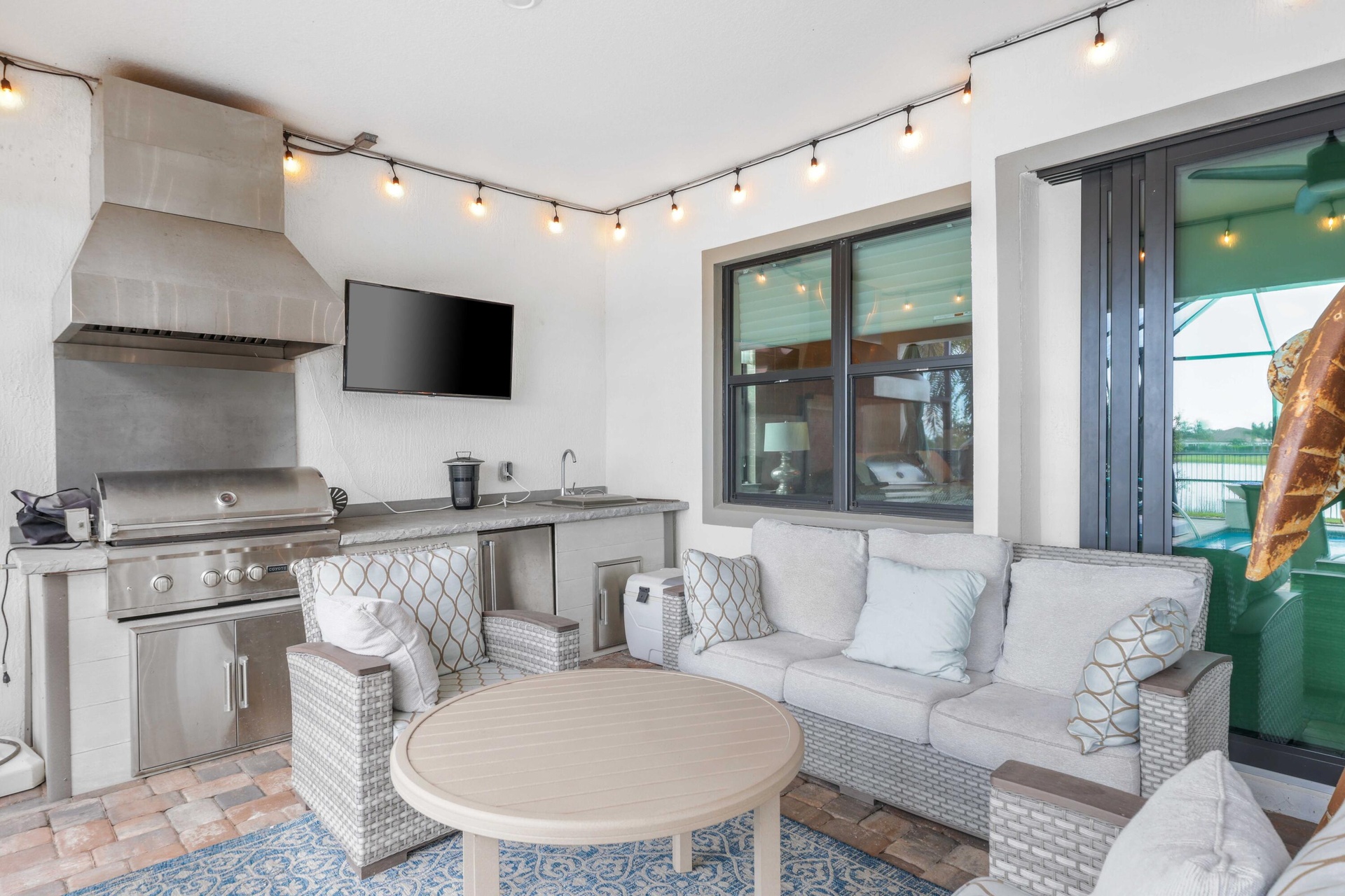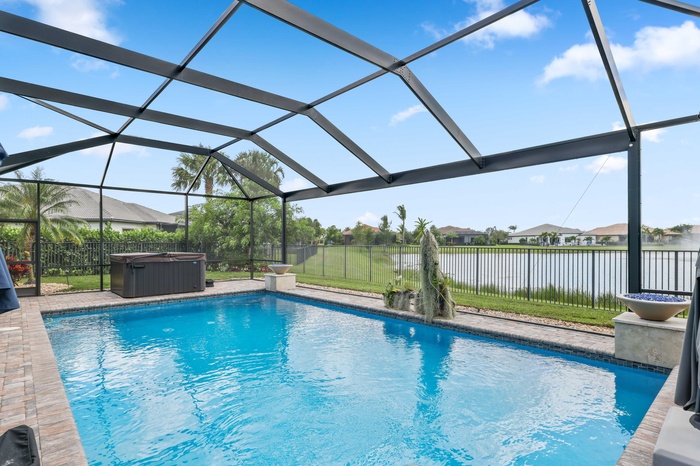 On one of the largest lots in Ancient Tree, this half-acre lakefront home offers wide fountain views and a backyard built for enjoyment. The saltwater heated pool, 6 1/2 feet deep, with fire bowls, hot tub, and panoramic screen enclosure, creates the perfect outdoor retreat. Entertain with ease on the patio featuring a summer kitchen with grill, fridge, ice machine, and trash. Inside, the custom kitchen includes 42'' upper cabinets, upgraded quartz, built-in pet bowls, and premium appliances: Fulgor range with gas burners and double electric ovens, wall oven, microwave, and pot filler. The open great room has coffered ceilings, while the primary suite offers generous closet space. Natural gas serves the dryer, water heater, grill, and burners. Oversized 3-car garage plus golf cart space.
