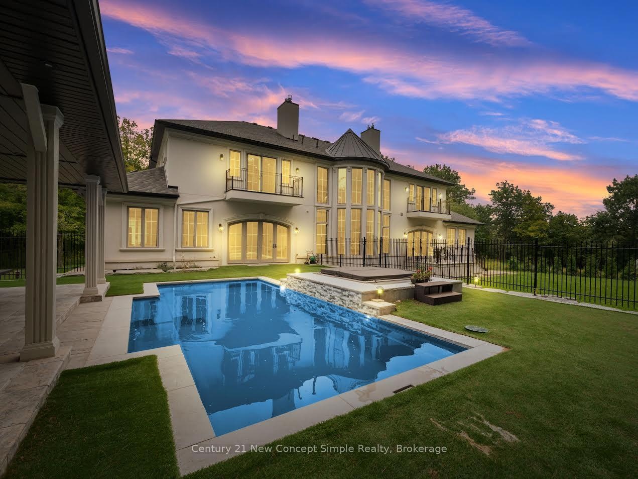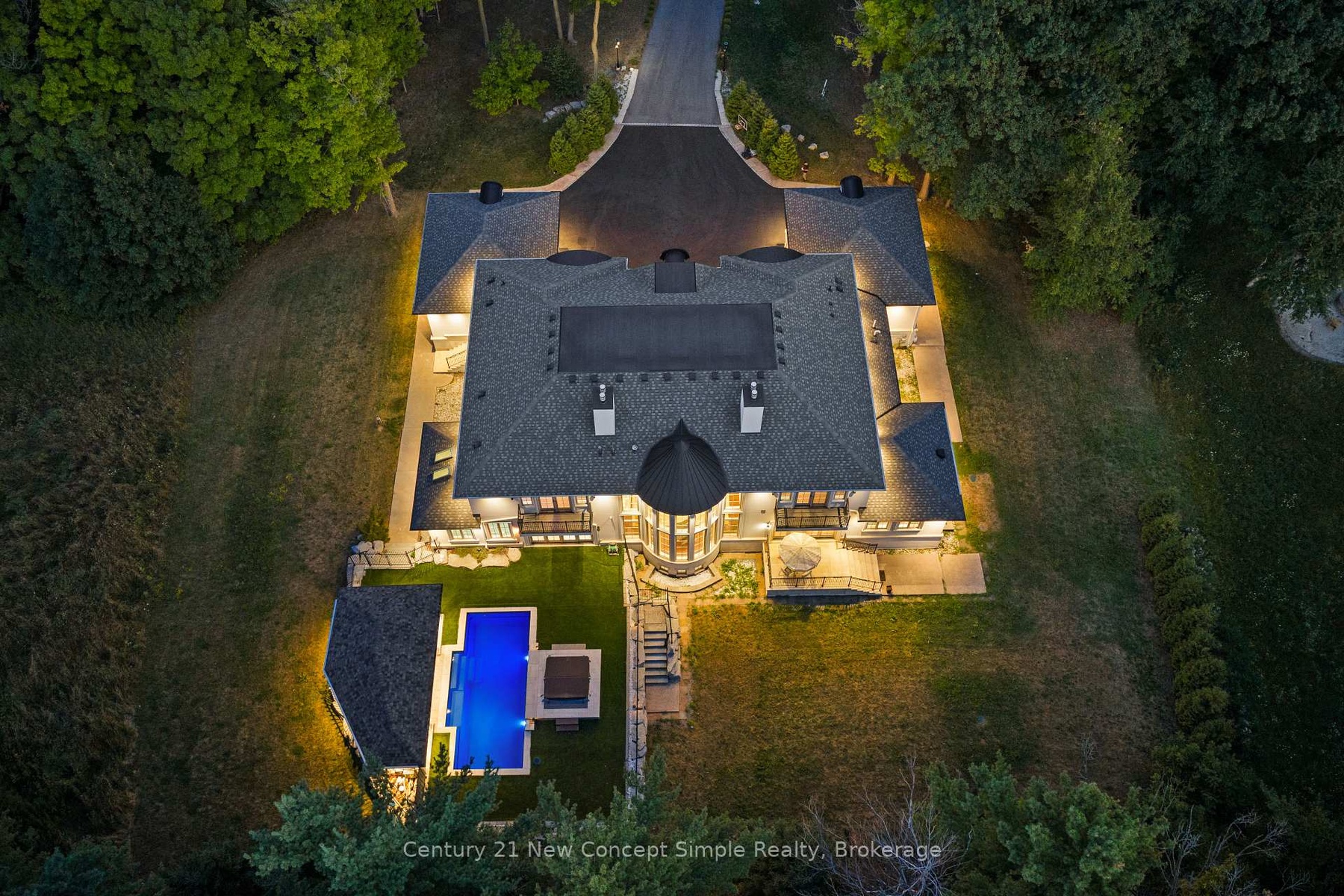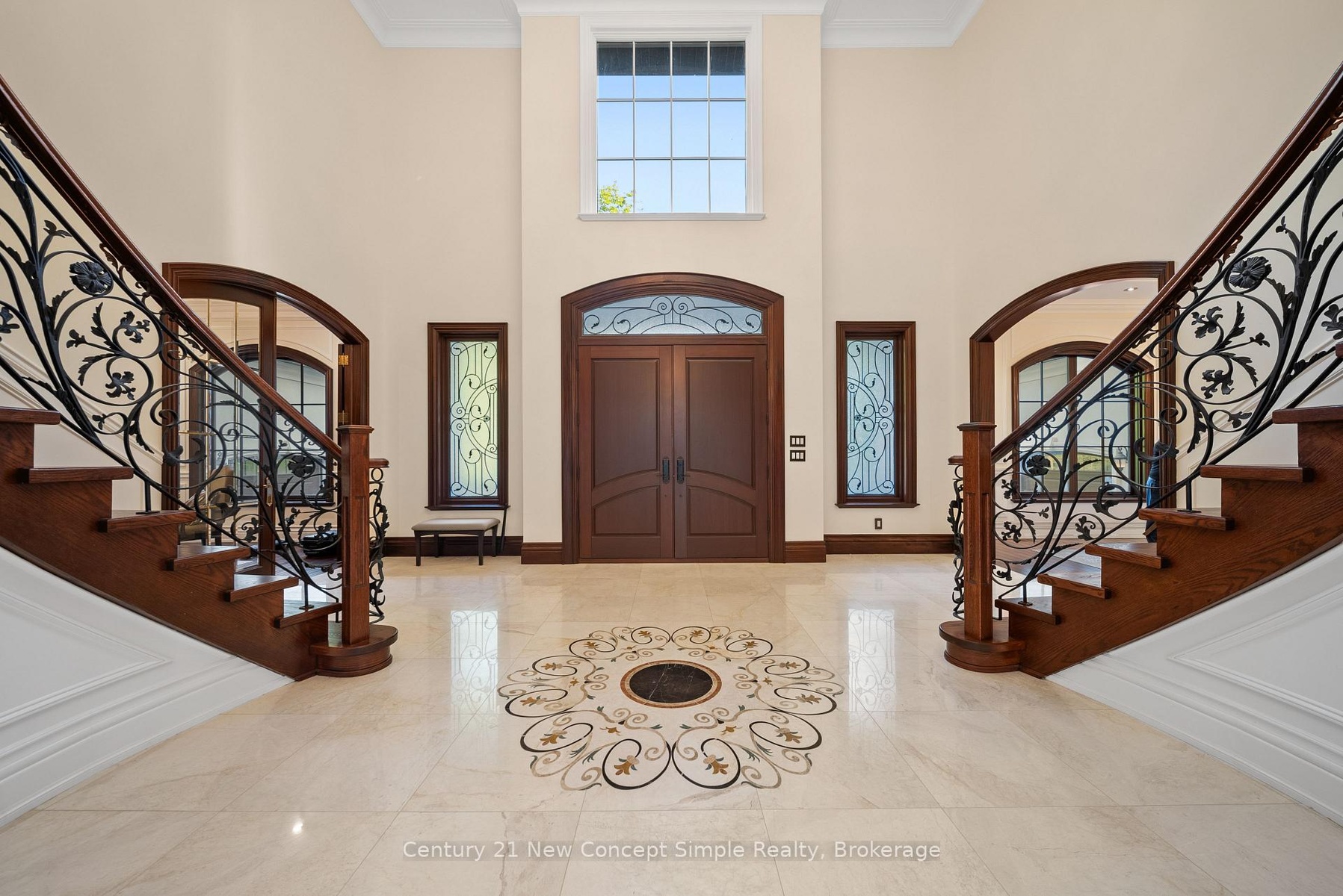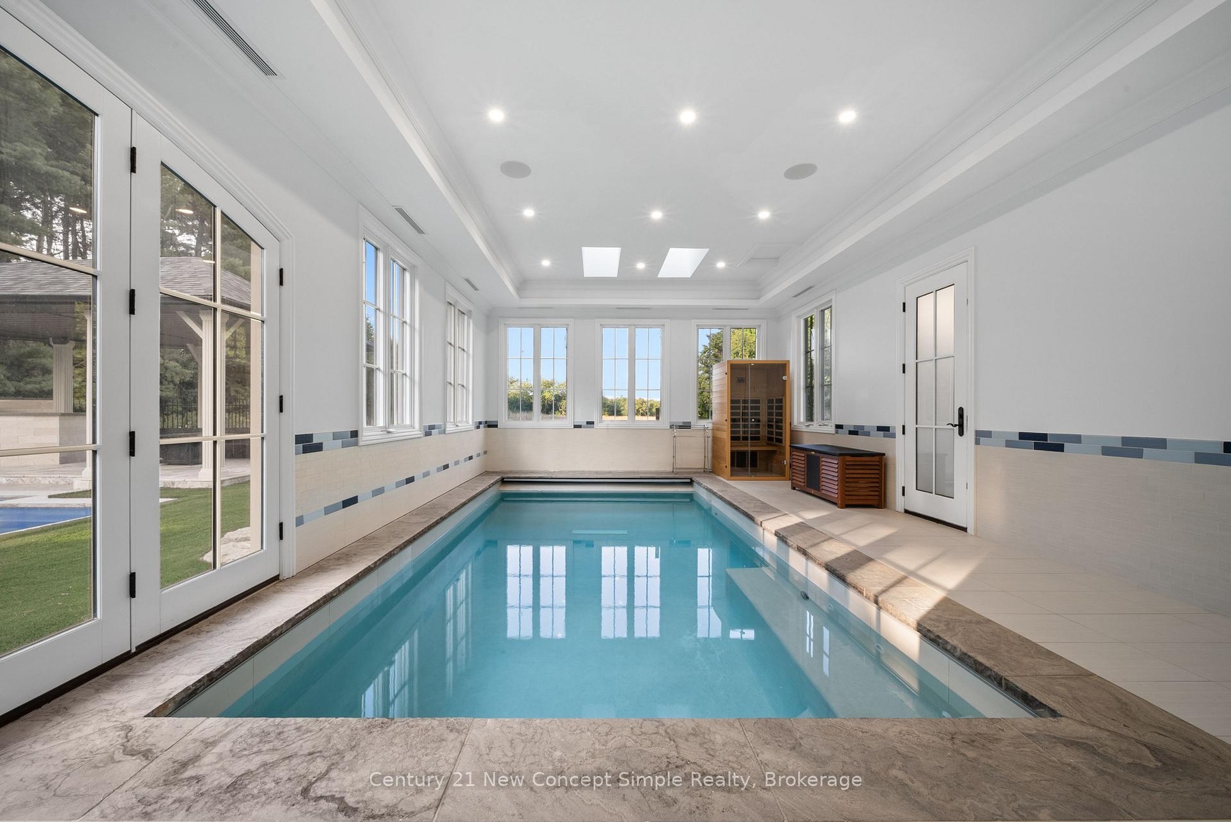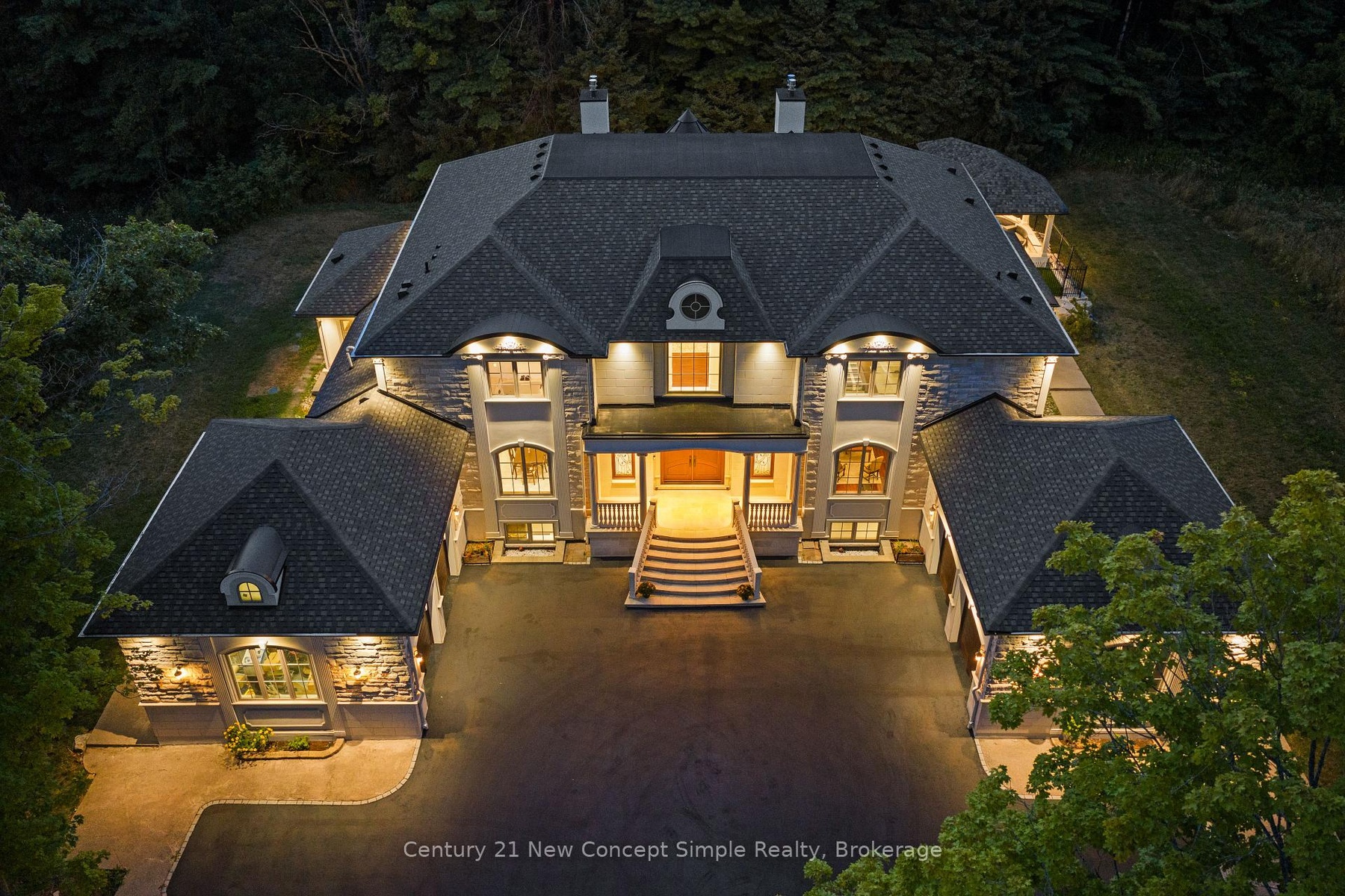 Set on 2.4 acres atop Burlington's Bluffs, this gated stone-clad estate offers more than 11,000+ sq. ft. of living space, uniting enduring strength with graceful design. Built to endure for generations, it blends permanence with refined elegance. Among its discreet luxuries are two pools one basking beneath the open sky, the other sheltered indoors creating a rare duality of year-round leisure. Inside, the drama begins in a soaring 21-foot ceiling foyer, framed by a sweeping double stairwell that sets the stage for the grandeur within. A private elevator connects all levels, complementing the six-zone heated flooring that carries comfort through every room. A dedicated media room provides the perfect retreat for cinematic nights at home. Every detail, from bespoke finishes to silent floor design and reinforced construction, reflects a vision of permanence and sophistication revealed room by room. Framed by an abundance of mature trees, the property balances privacy with convenience, moments from the city's best amenities.