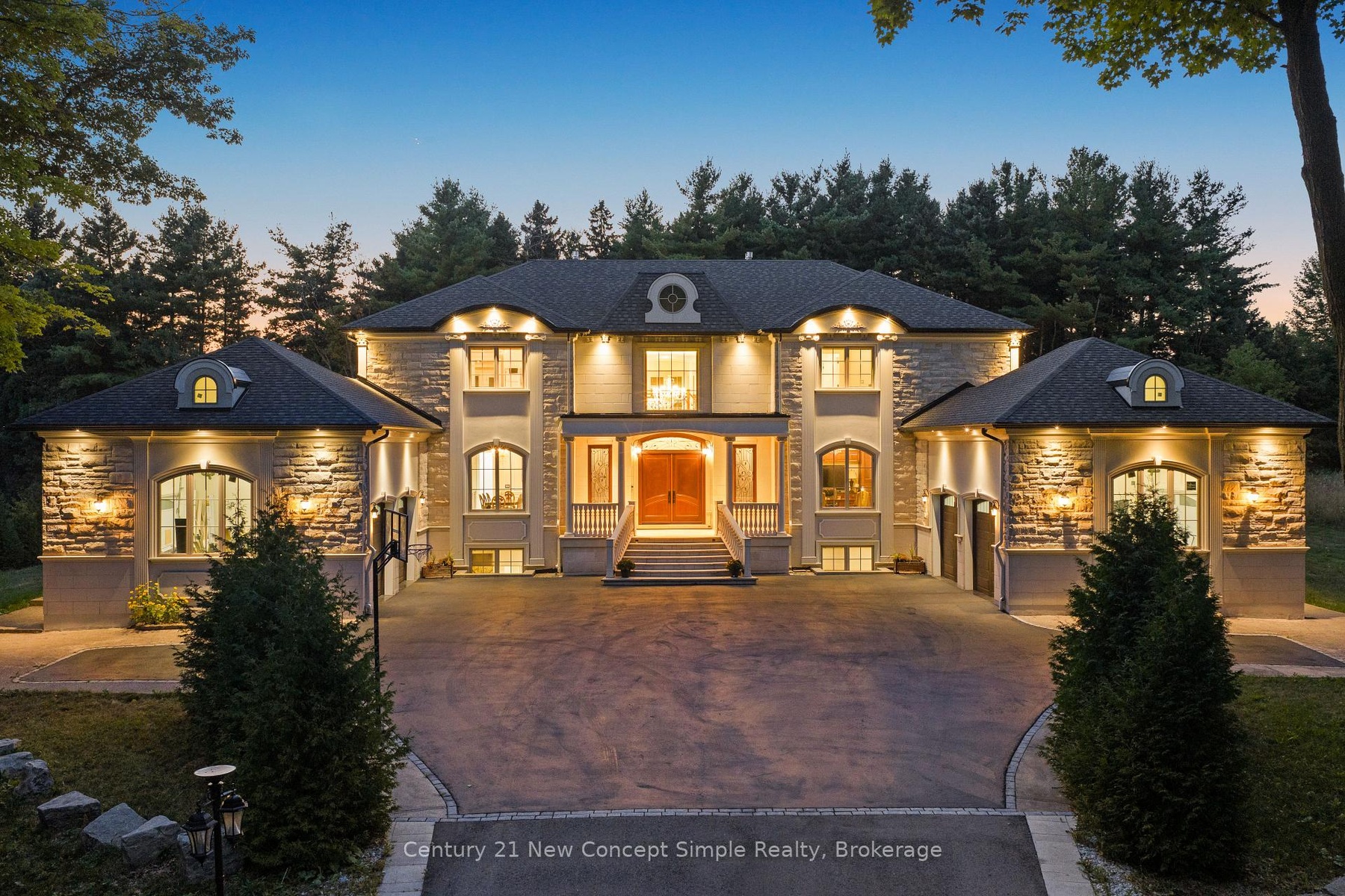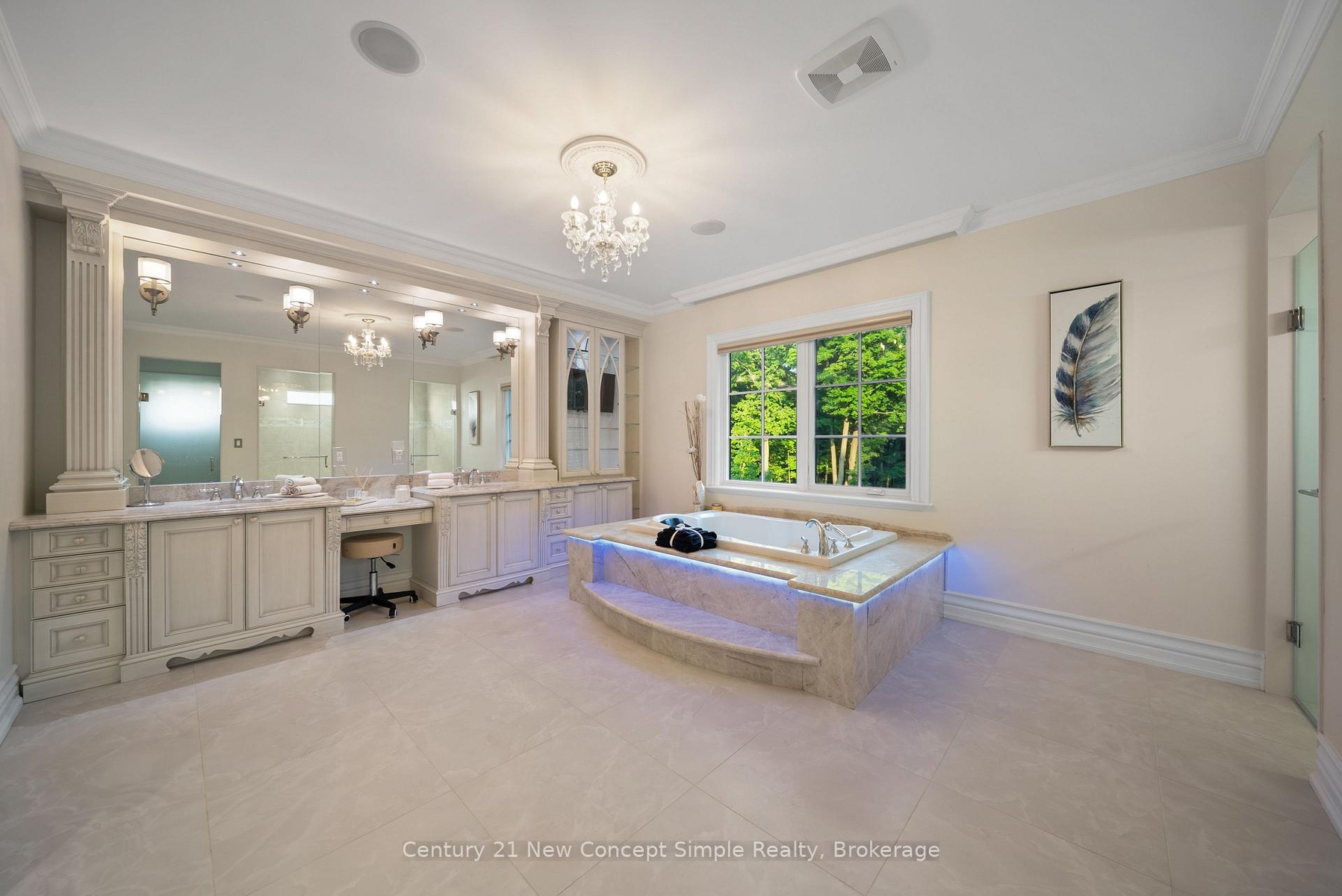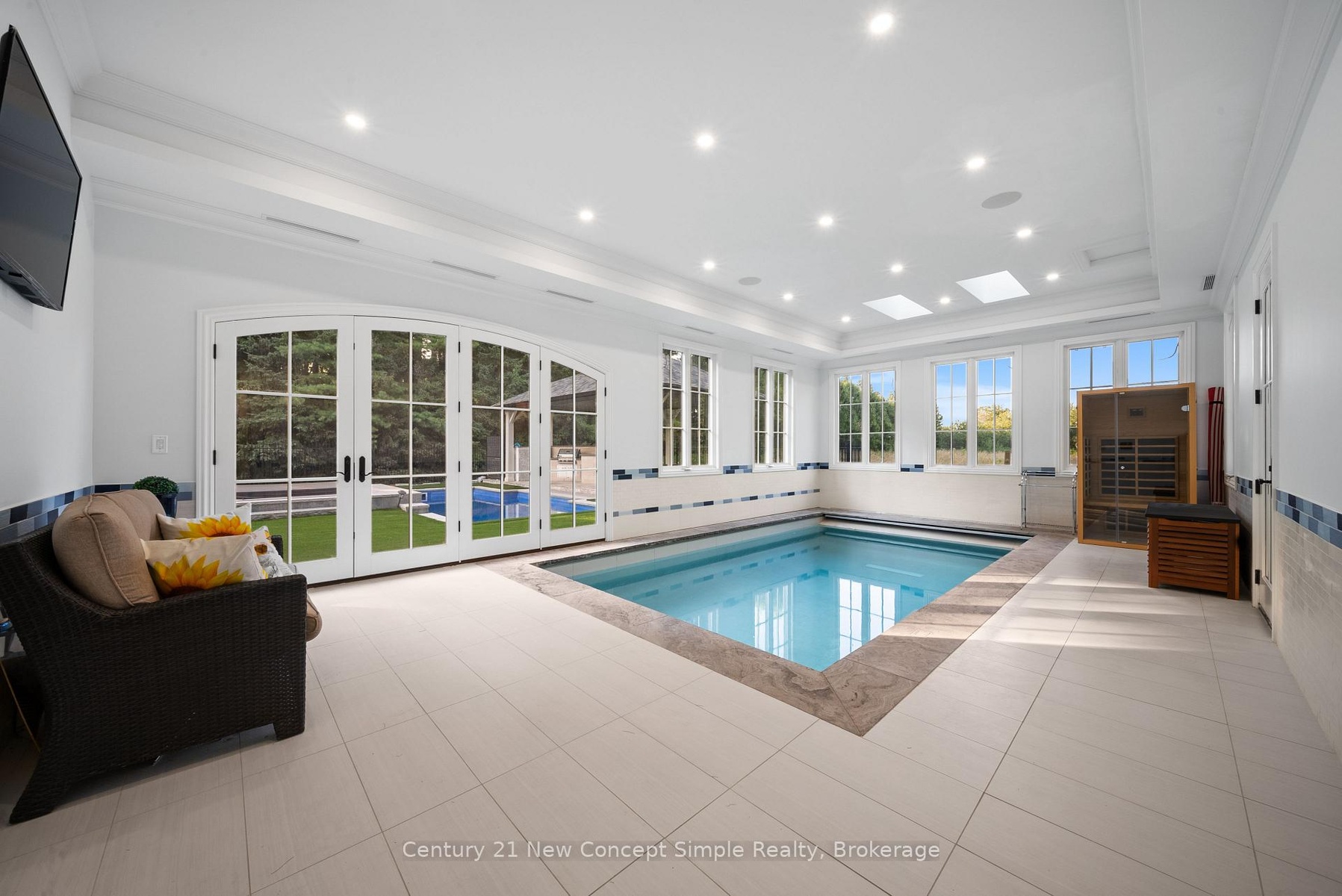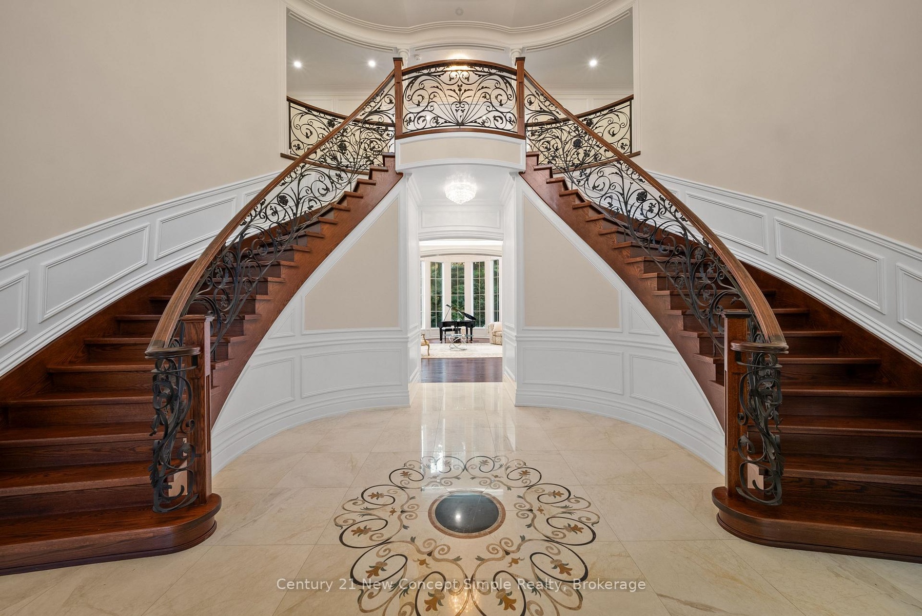 Set on 2.4 acres atop Burlington's Bluffs, this gated stone-clad estate offers more than 11,000+ sq. ft. of living space, uniting enduring strength with graceful design. Built to endure for generations, it blends permanence with refined elegance. Among its discreet luxuries are two pools one basking beneath the open sky, the other sheltered indoors creating a rare duality of year-round leisure. Inside, the drama begins in a soaring 21-foot ceiling foyer, framed by a sweeping double stairwell that sets the stage for the grandeur within. A private elevator connects all levels, complementing the six-zone heated flooring that carries comfort through every room. A dedicated media room provides the perfect retreat for cinematic nights at home. Every detail, from bespoke finishes to silent floor design and reinforced construction, reflects a vision of permanence and sophistication revealed room by room. Framed by an abundance of mature trees, the property balances privacy with convenience, moments from the city's best amenities.