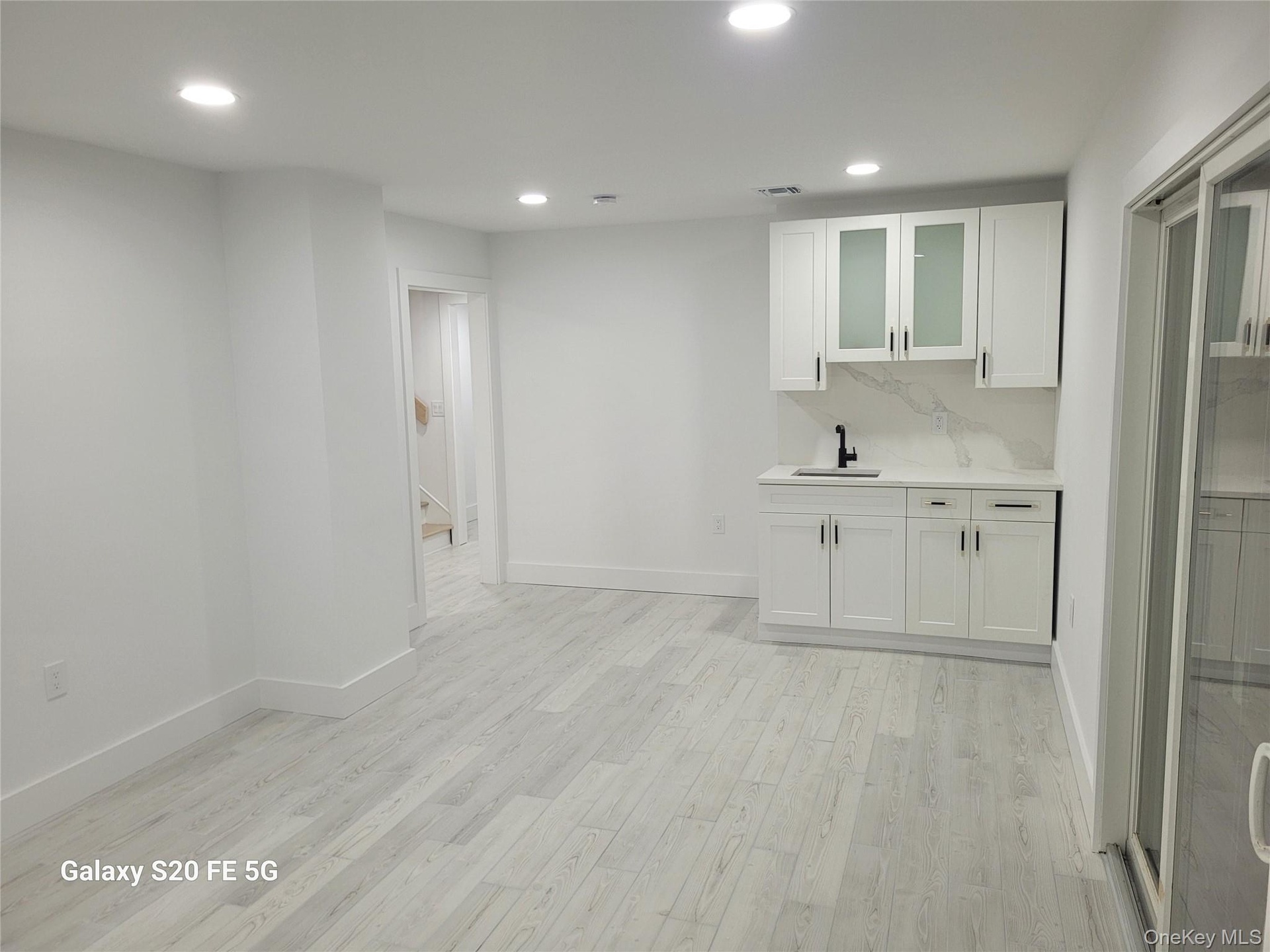 - Kitchen with white cabinets, glass insert cabinets, recessed lighting, light wood-style flooring, and light stone countertops
