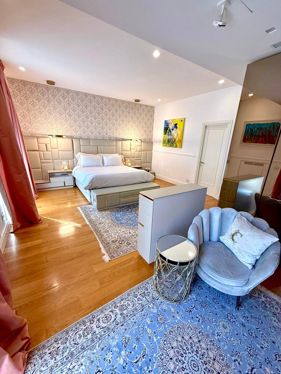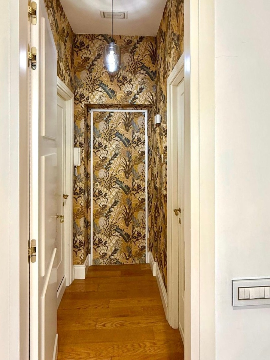 - Wall paneling (boiserie) in the living room and hallway, combined with recessed lighting in the ceilings, create a refined and sophisticated atmosphere.