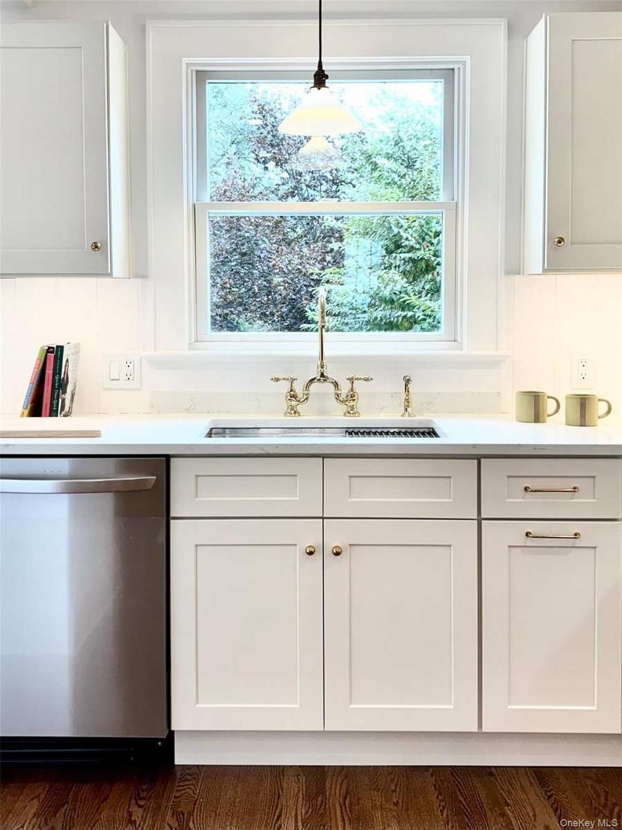 - Kitchen with hanging light fixtures, white cabinets, stainless steel dishwasher, and healthy amount of natural light
